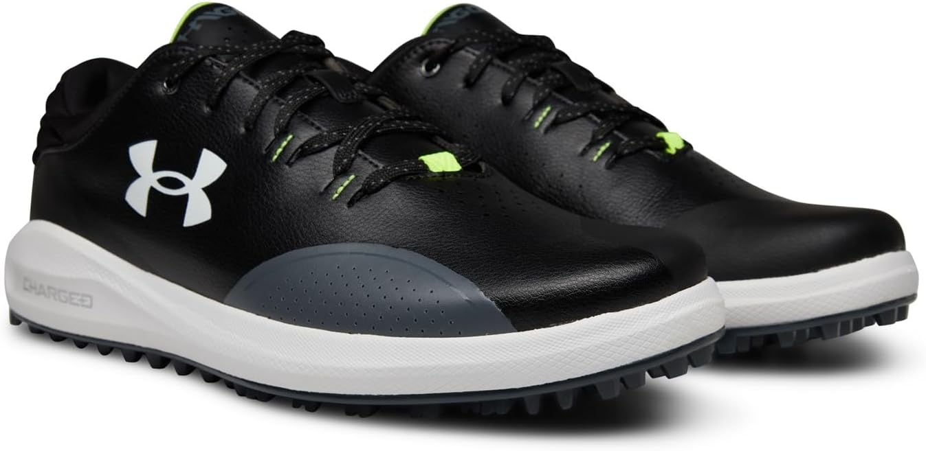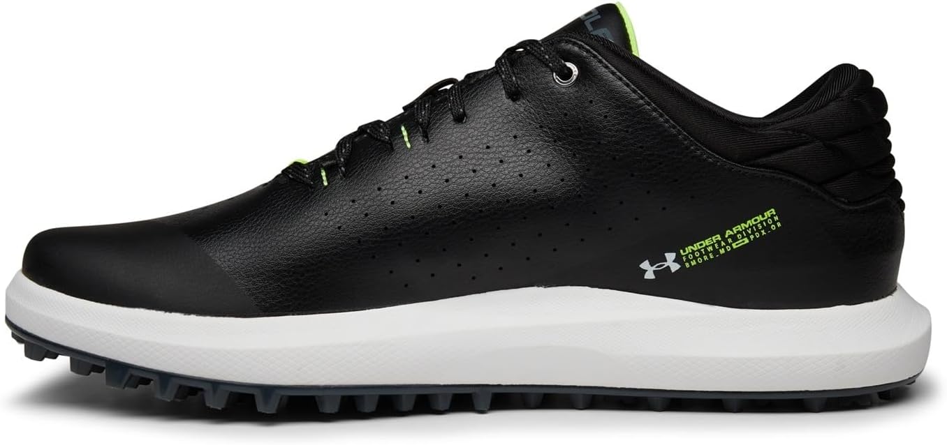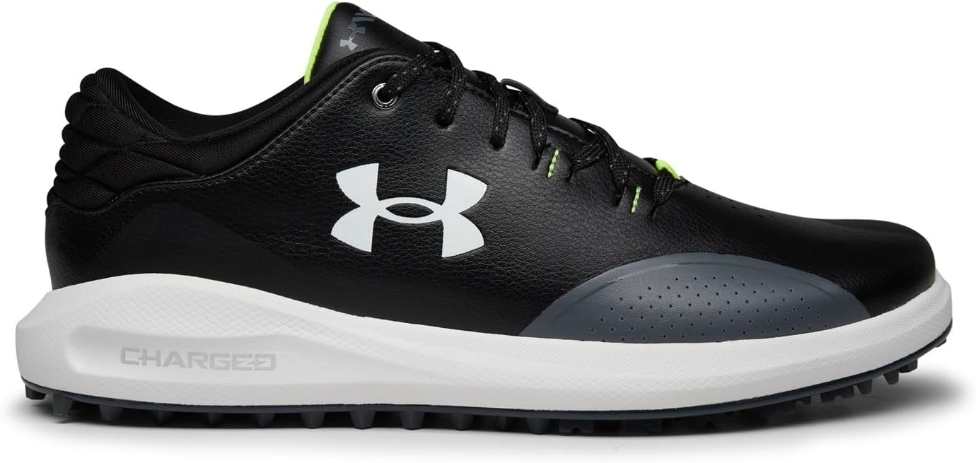 Golf spikes that keep your feet comfortable to keep you focused. The microfiber leather is light but durable, the Charged Cushioning® absorbs impact, and the Never-Wet treatment keeps you dry. Breathable & durable microfiber leather upper with Never-Wet treatment to keep you cool & dry. Charged Cushioning® midsole uses compression molded foam for ultimate responsiveness & durability. UA Rotational Resistance outsole for lightweight lockdown traction. Spikeless outsole for a lighter, more flexible feel without any compromise in traction. 1 year waterproof warranty, Weight: 9.8 oz. Lace type: Standard tie.