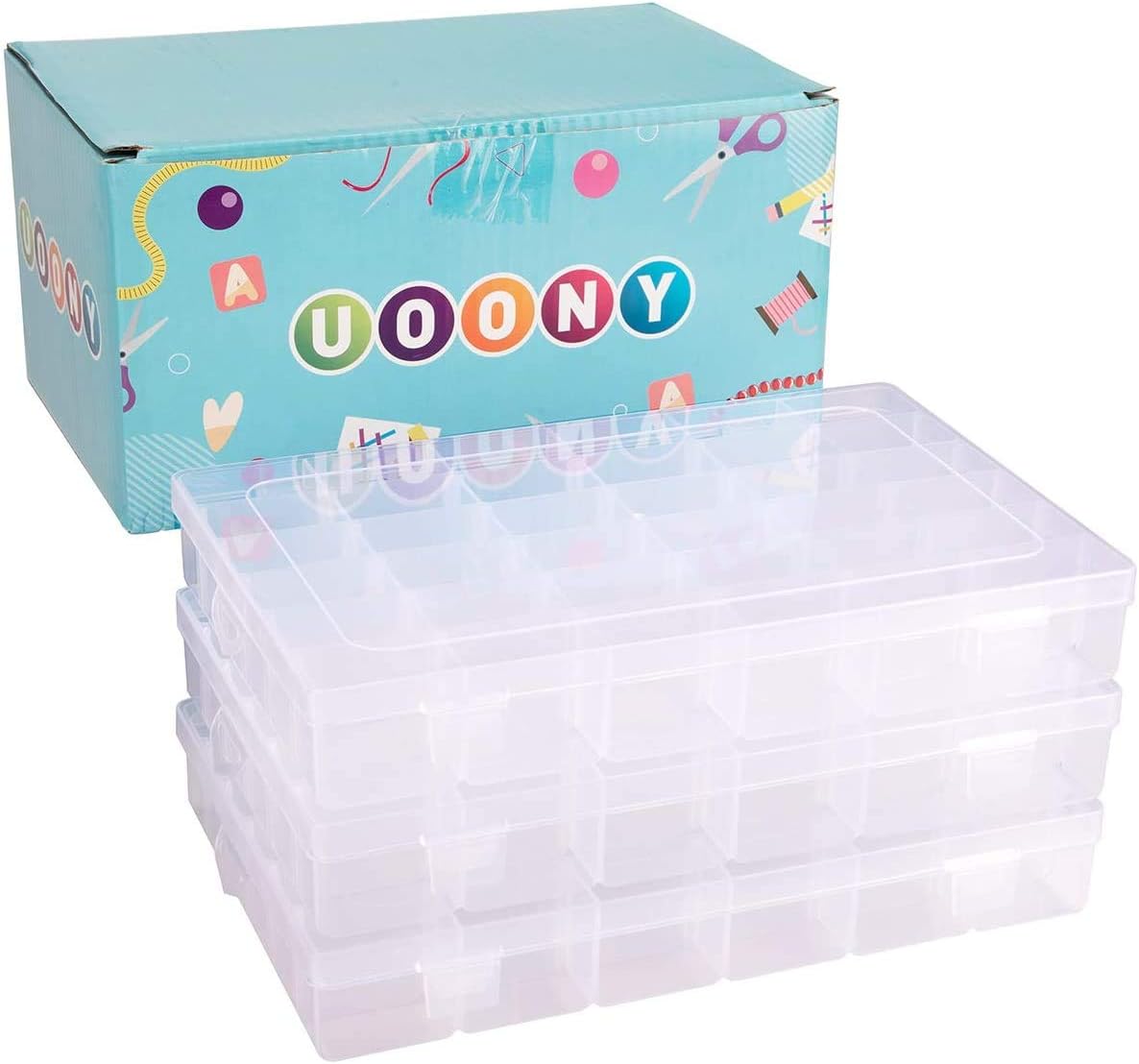 UOONY 3 Pack 36 Grids Plastic Organizer Box Craft Storage with Adjustable Dividers, Bead Organizer Container Clear Storage Box for Fishing Tackles Crafts Jewelry Thread with 400pcs Label Stickers