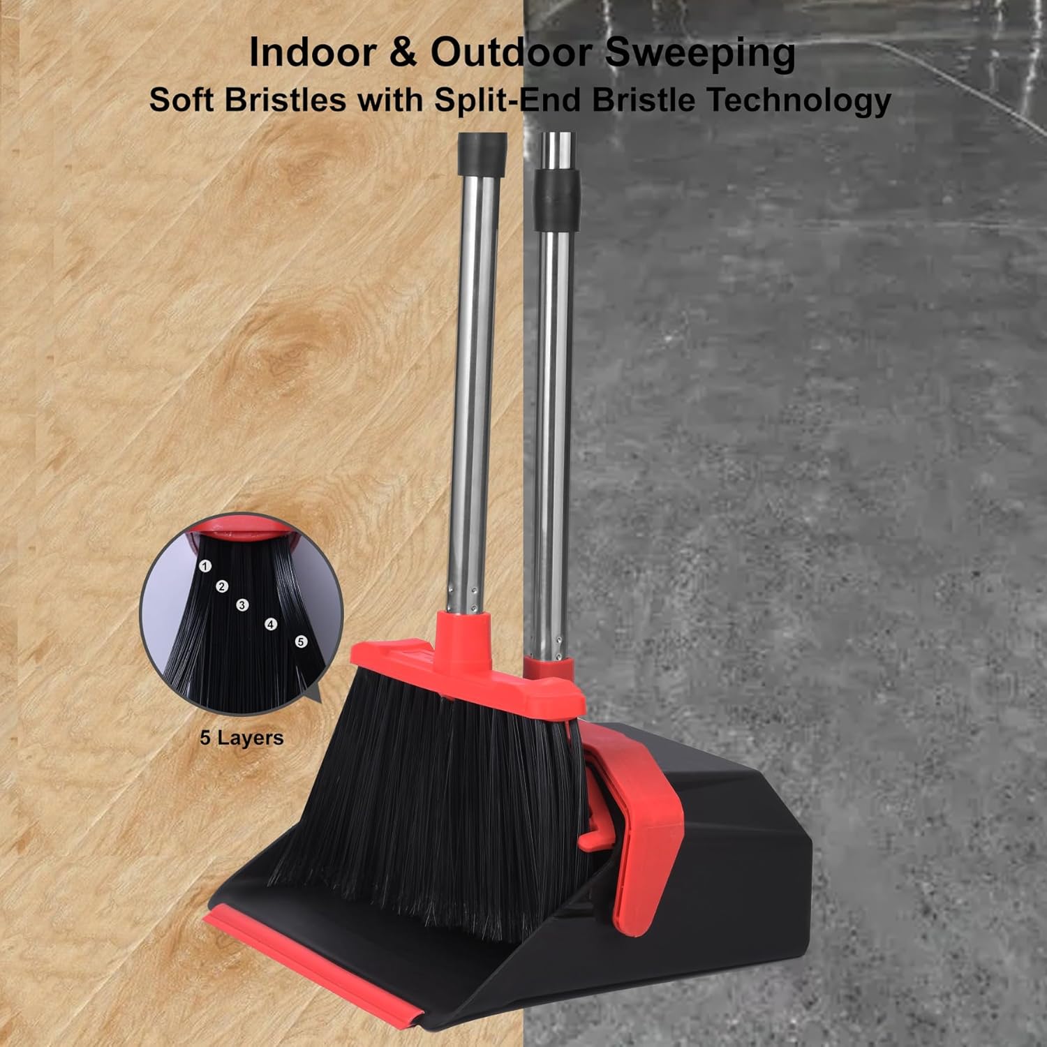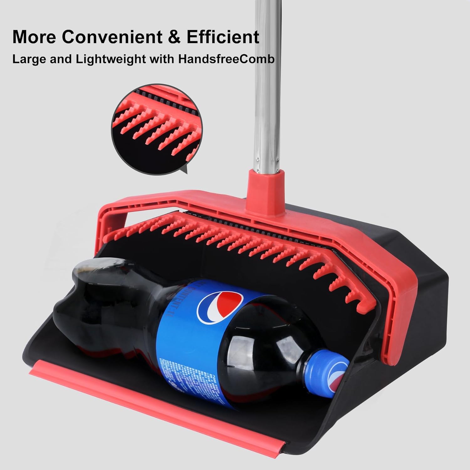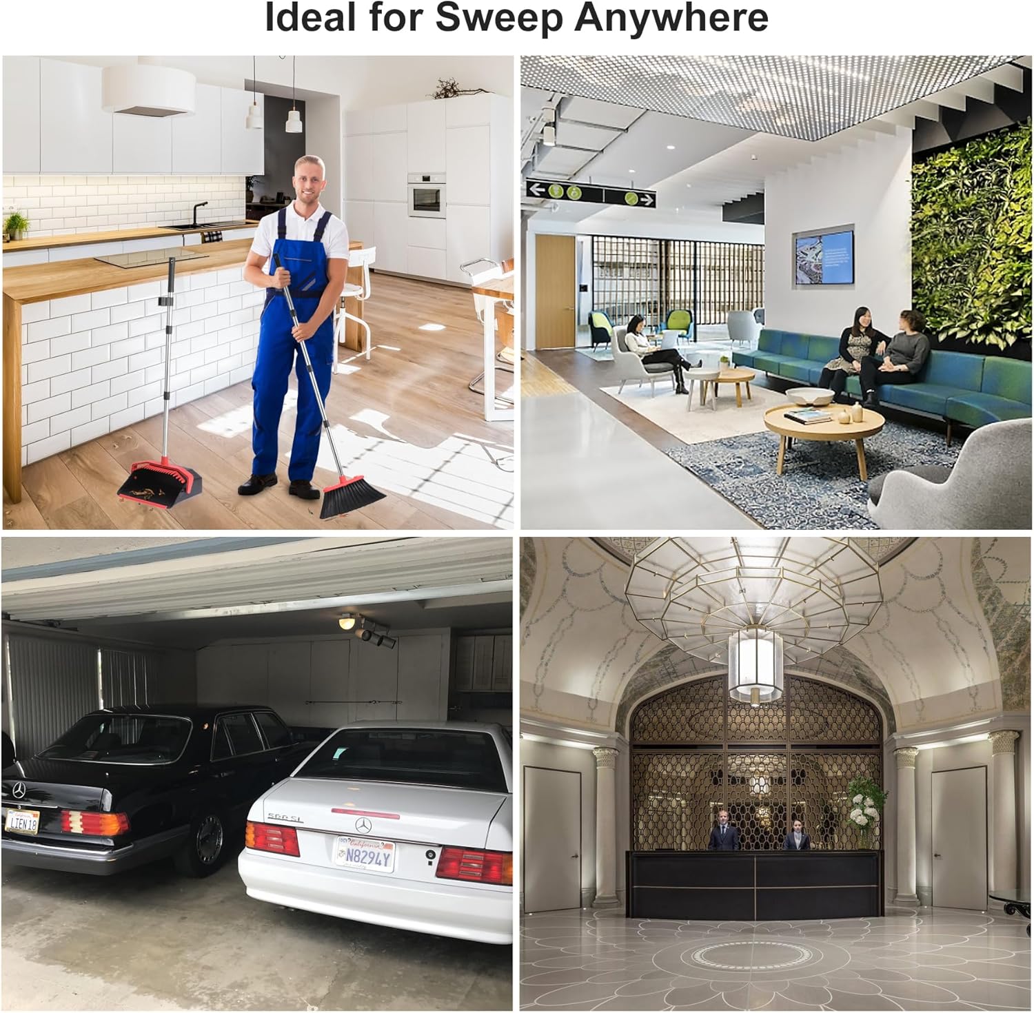 Upgrade Broom and Dustpan Set with 51” Long Handle, Large Upright Brooms and Dust Pans, ZeroGap Lip, Self-Cleaning Dustpan Teeth for Lobby Kitchen Office Restaurant – Black and Red