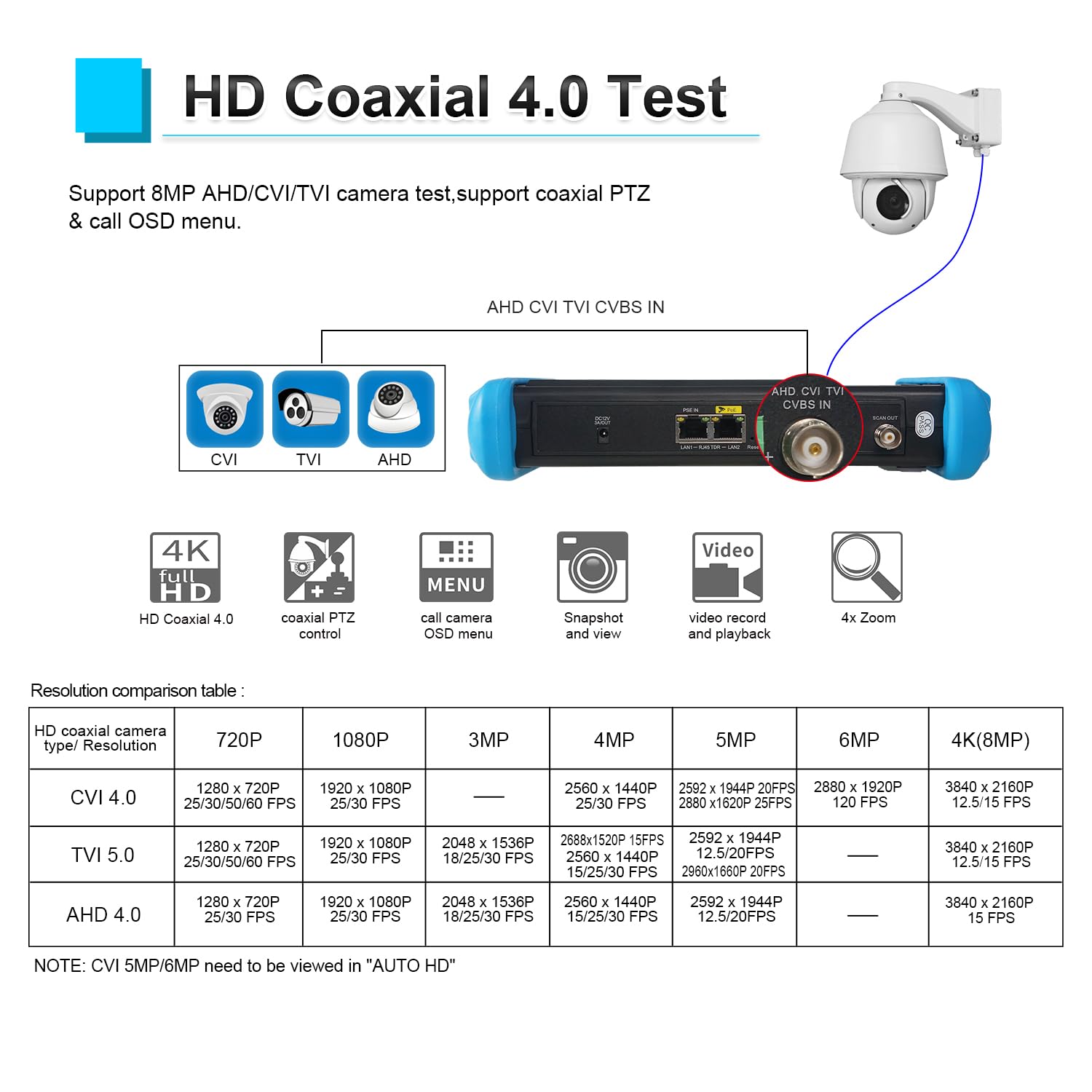 【AHD TVI CVI Camera Tester】WANLUTECH IP camera tester with poe support to test max 8MP AHD/TVI/CVI/CVBS camera. Using “AUTO HD” app can automatically recognize AHD CVI TVI CVBS cameras and display resolution and frame rate on the screen, supports UTC control & call OSD menu, menu settings, screenshot, video recording, video playback, etc. Support color bar generator, output one channel PAL/NTSC color bar video signal.