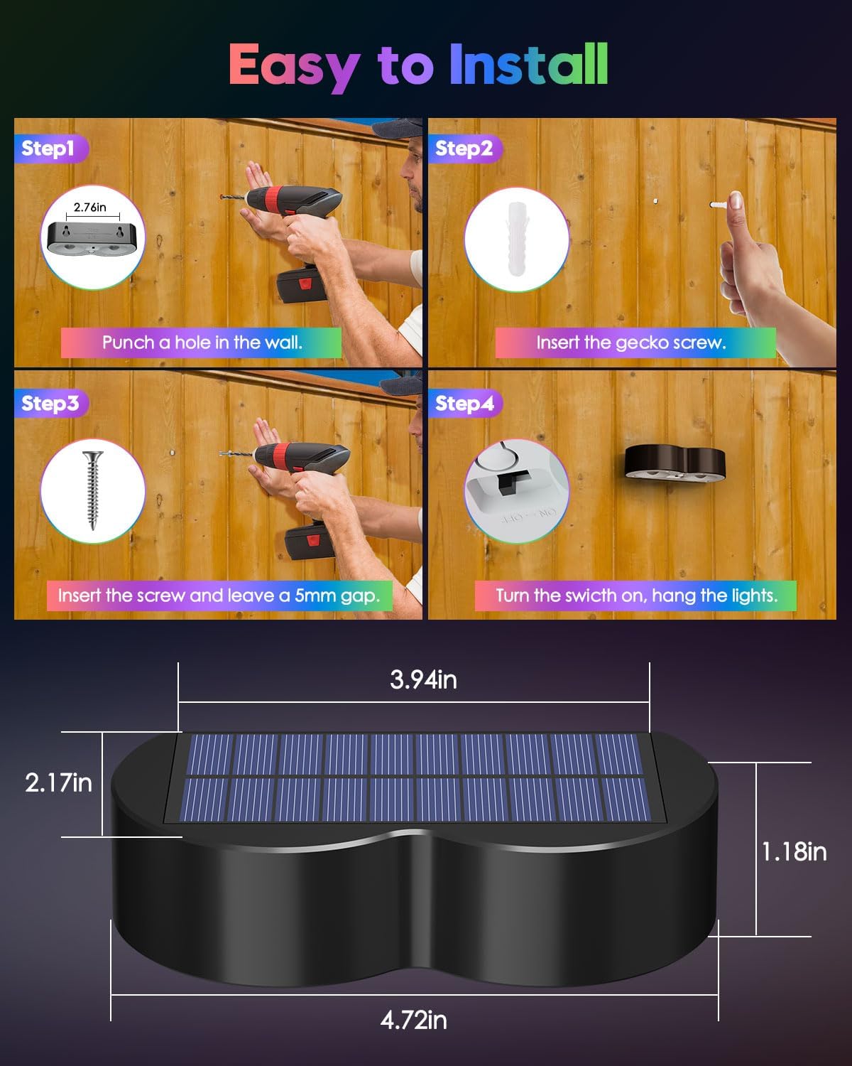 【Easy Setup Solar Fence Lights】Solar fence lights come with 2 installation options, by using double-face tape to install solar fence lights on the wall or any other smooth surface. Or use the provided screws to mount it on a wooden fence, tree, or any other textured surface.
