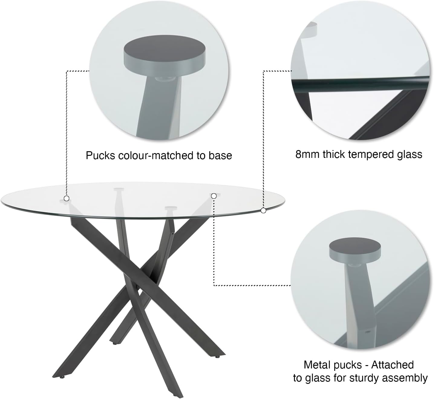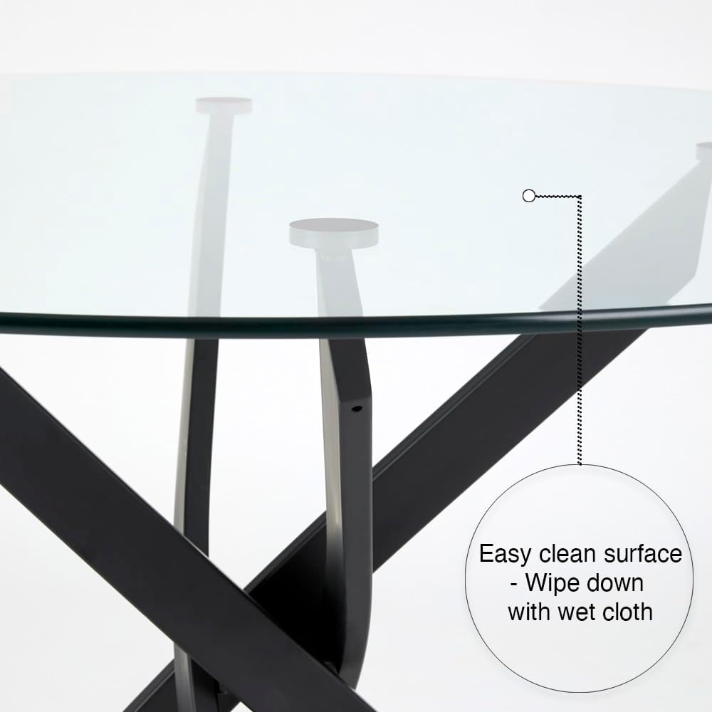 Elevate your dining space with this Modern Round Dining Table for 4 by Uptown Club. This exquisite glass kitchen table features a stunning round tempered glass top, perfectly complemented by an intricate steel base with four criss-cross slats, adding a touch of elegance to any meal.
