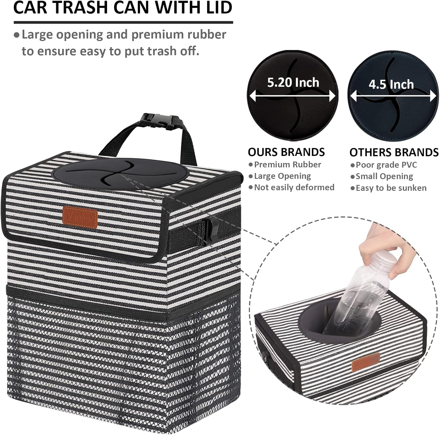 Soft lid to put the bottle and other car trash easily. Don’t worry about soiled by unfinished drinks.