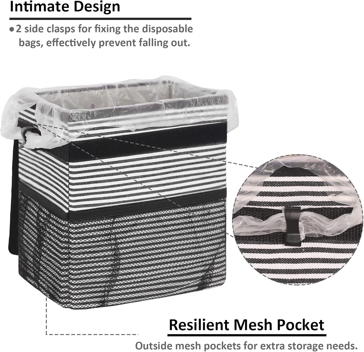 【Intimate Design& Capacity 】- There are 2 side clasps for fixing disposable bags, effectively preventing falling out. Car trash bags have about 2 .5 Gallons for storage of car garbage or other stuff. Car trash bin has 100% leak-proof PEVA thick lining, no spillages will happen and is easy to be cleaned. The extra-large opening is made of elastic soft rubber, very roomy and easier to put litter into the bag, and helps to keep trash from spilling.