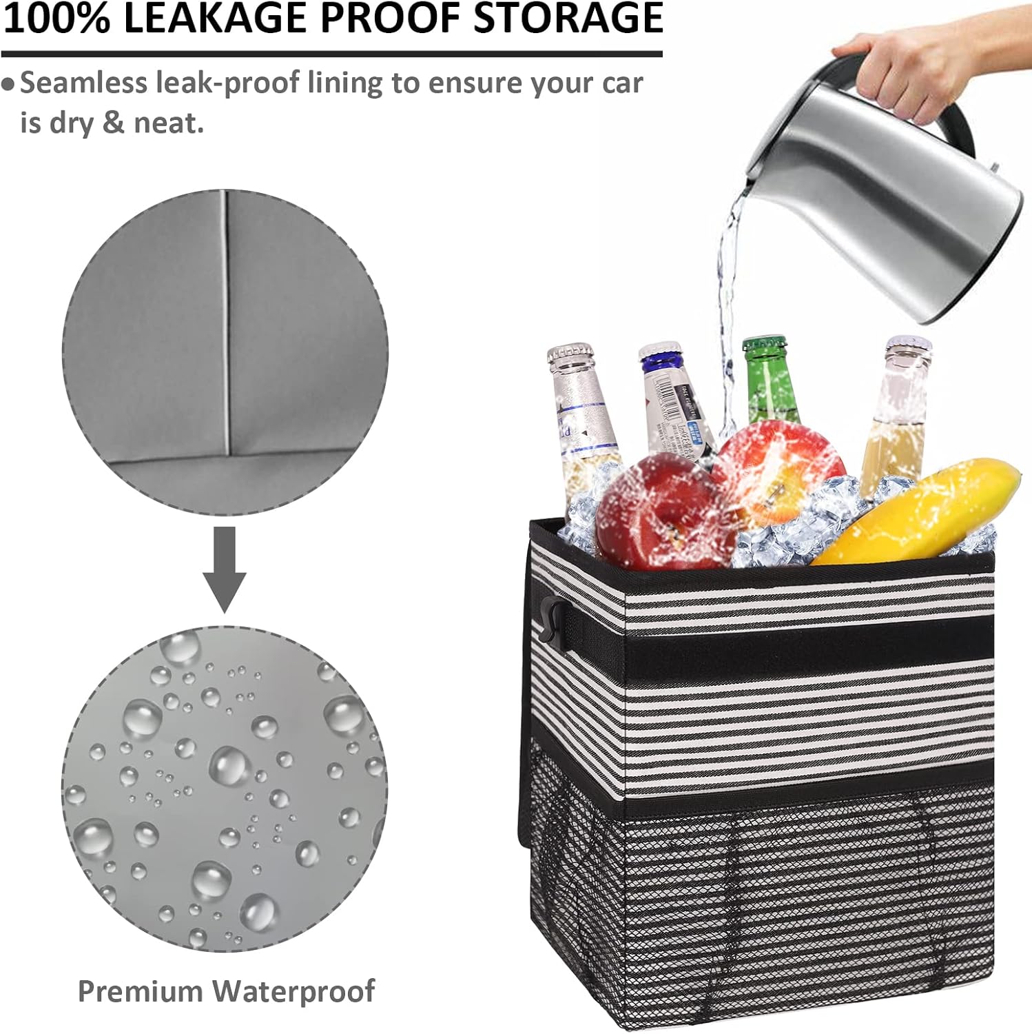 【Multipurpose Storage】- Vankor car garbage can is functional, you can put the car garbage into the main bag, there are 3 outer pouch pockets of garbage can for car that will be great to help storage. You can put tissue packs, wipes, snacks, umbrellas, and other little things that you need to keep in your car to avoid mess, and for easy access. In addition, the waterproof performance also achieves the automotive garbage cans an excellent storage bag when you are camping or picnicking.