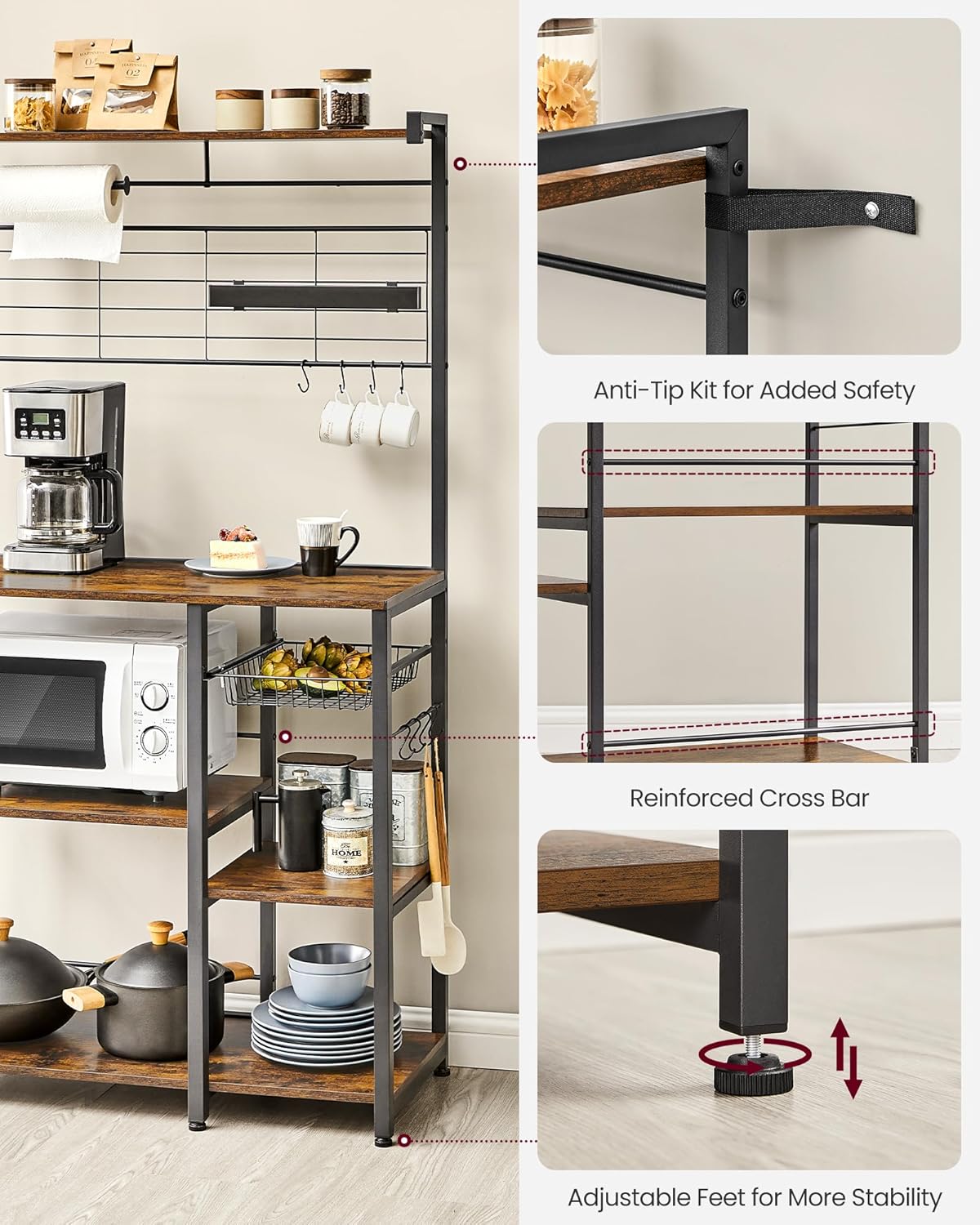 [Stable and Safe] Crafted with high-quality particleboard and steel, this baker’s rack boasts a sturdy and safe frame. The stability and safety of the kitchen shelving are further enhanced by both its adjustable feet and the included anti-tip kit