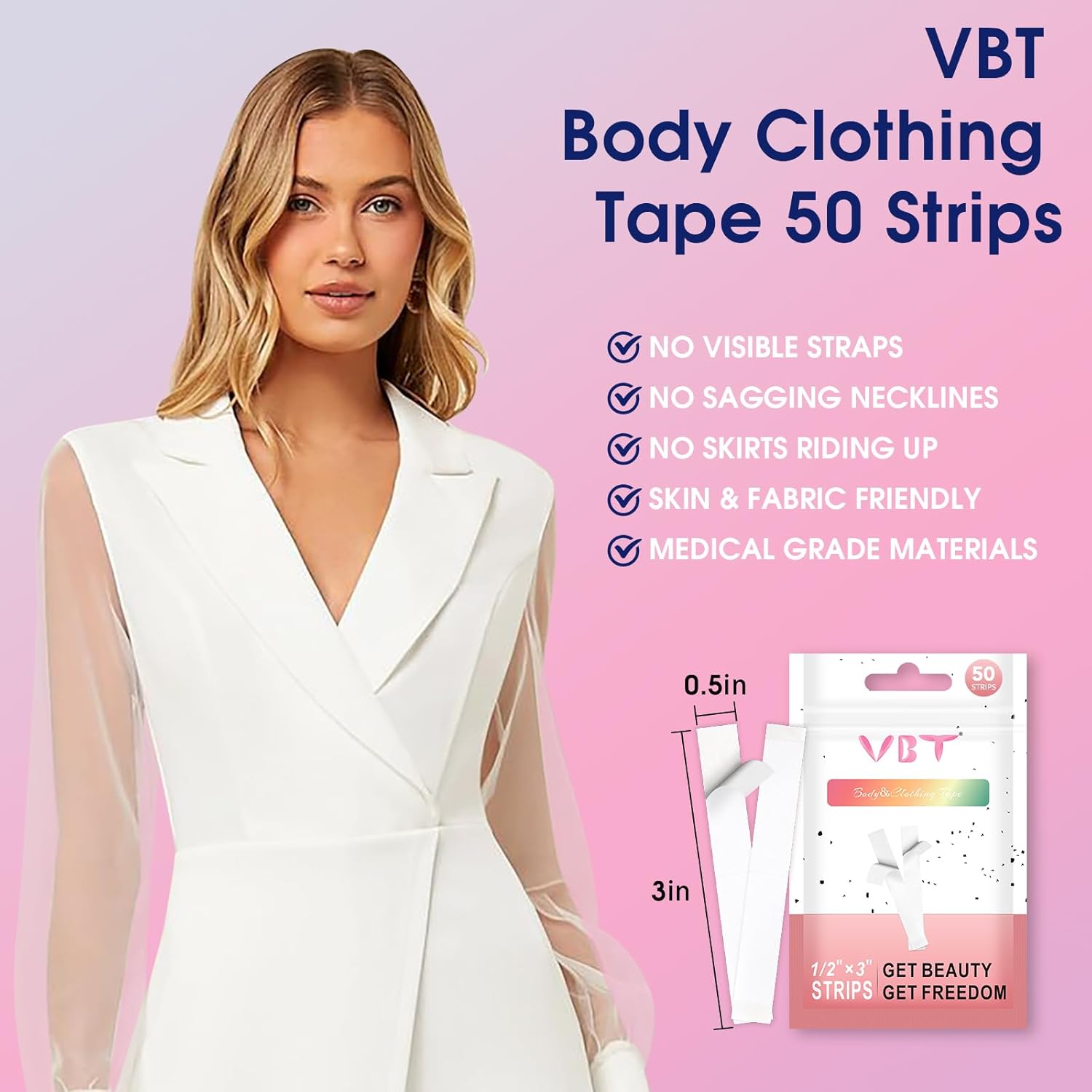 VBT Double Sided Tape for Clothes – Fashion Clothing Tape for Dress, Transparent Tape for Sensitive Skins (Clear, 50 Strips)