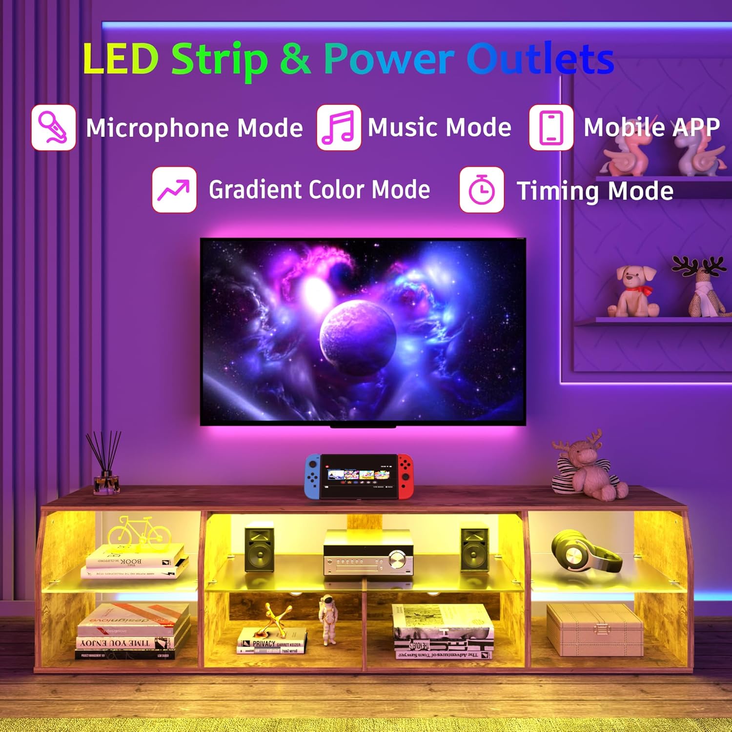 VECELO LED Gaming TV Stand with Power Outlets Television Cabinet with 7 Open Storage Shelves, Industrial Entertainment Center for Living Room and Bedroom, Light Brown, 70inch