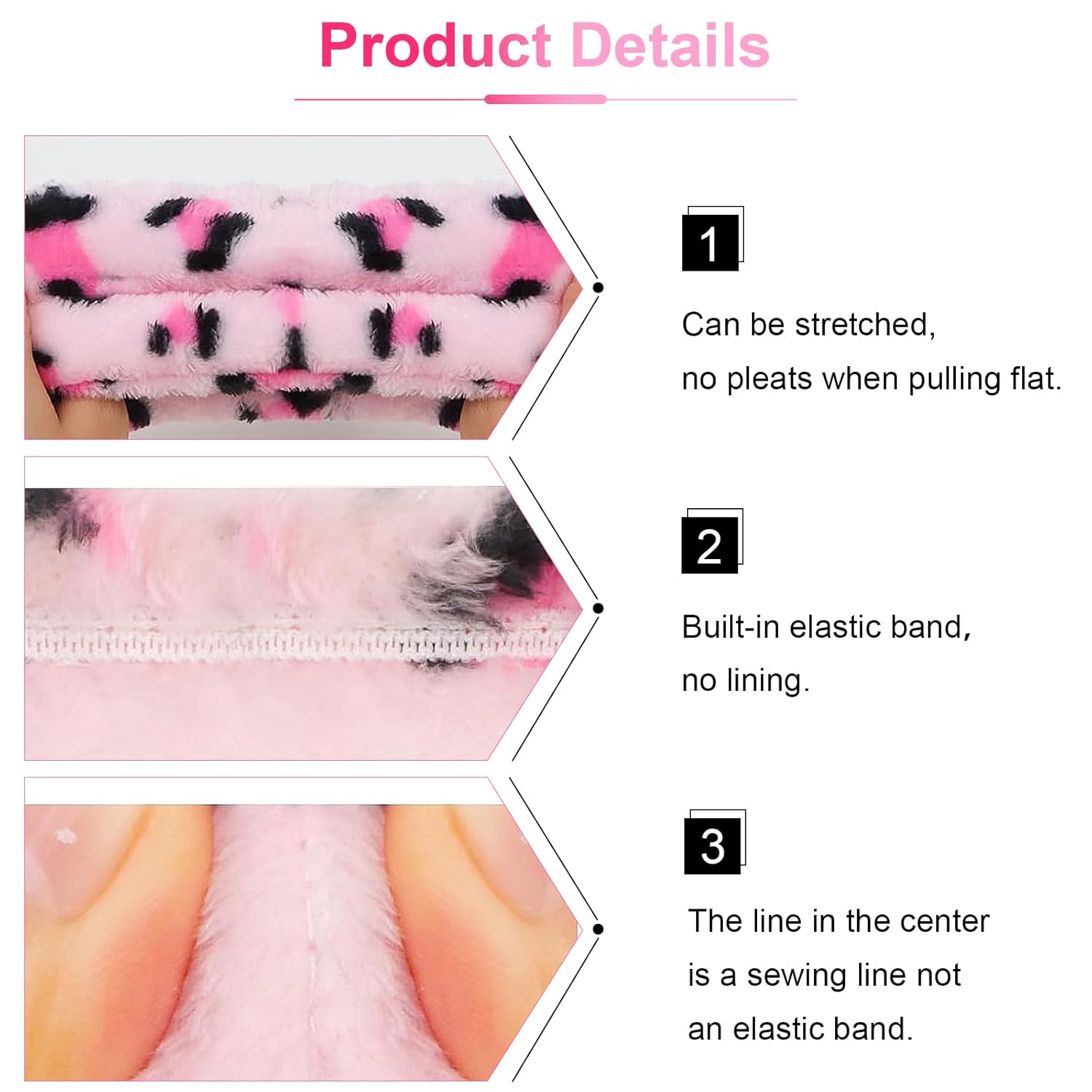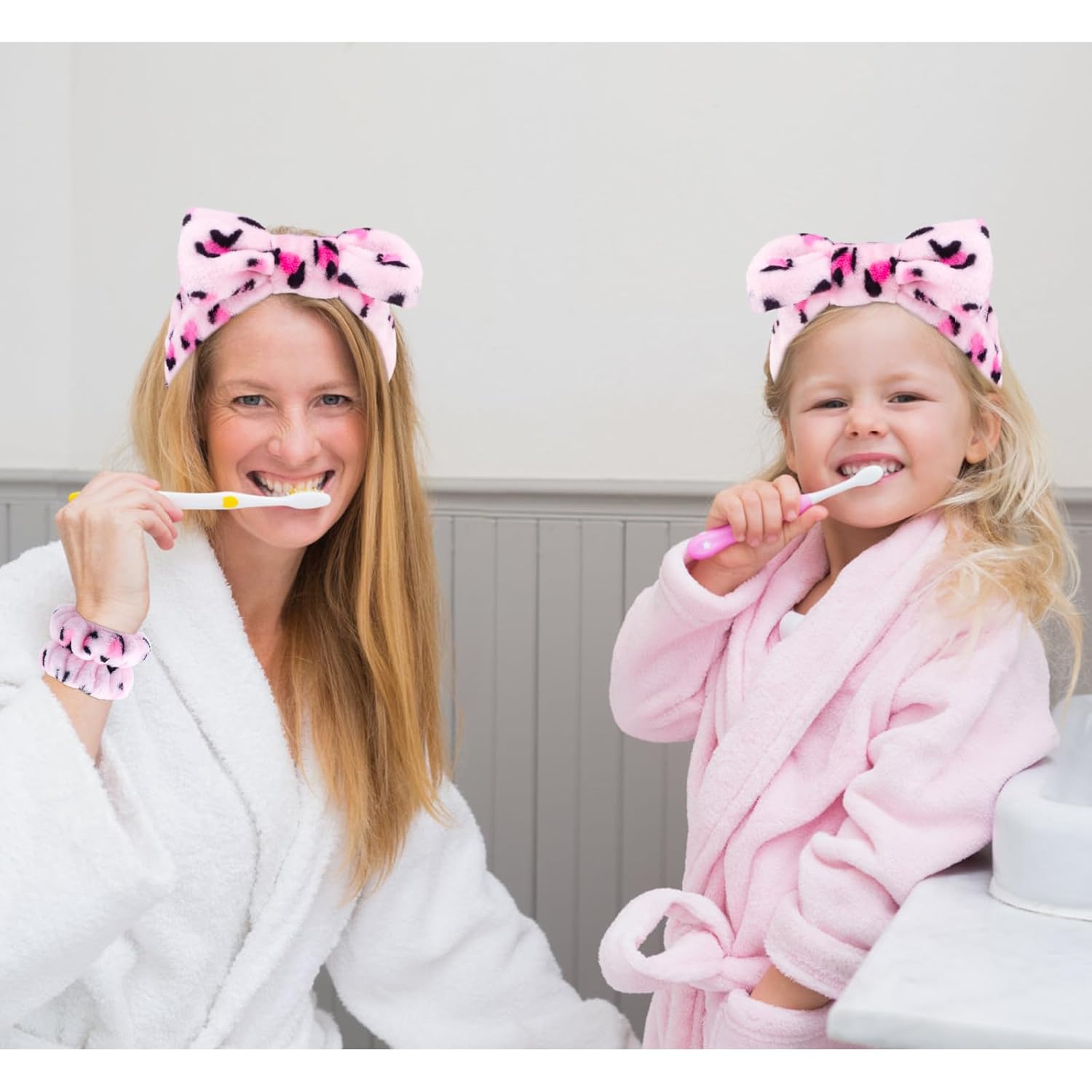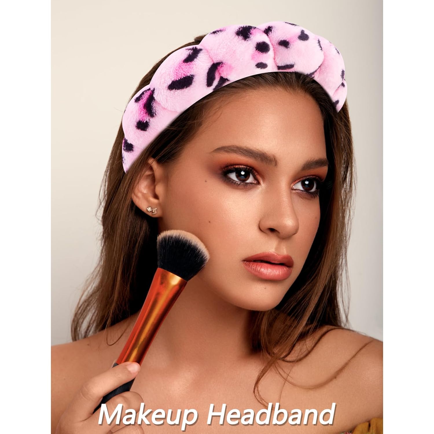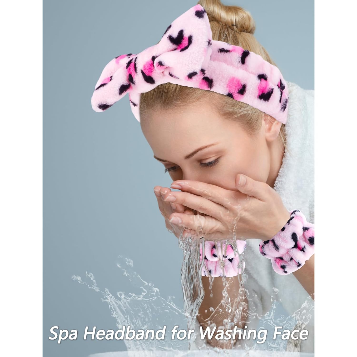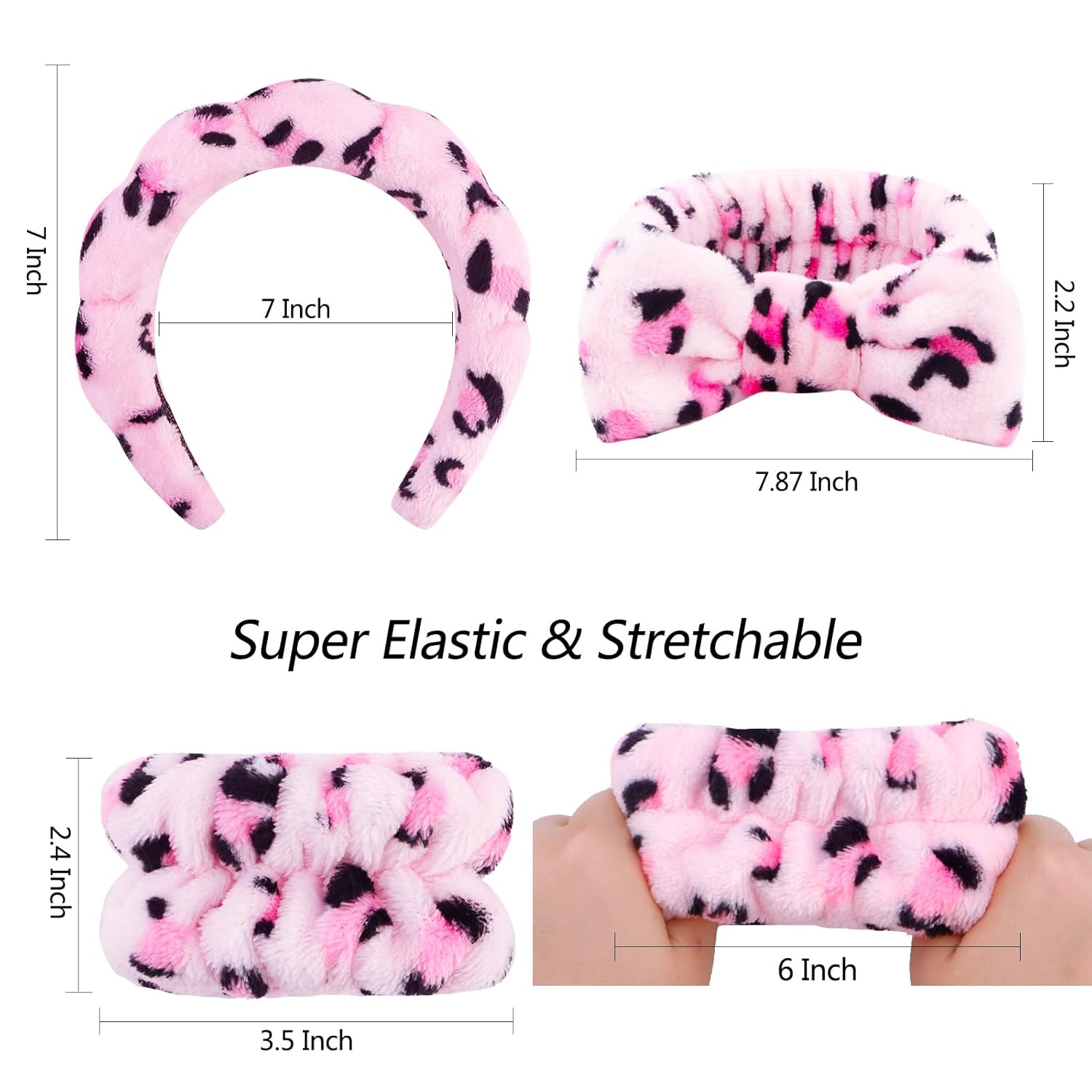 VELSCRUN 4 Pcs Spa Headband, Face Wash Headband, Skincare Headbands, Makeup Headband, Pink Leopard Puffy Sponge Hair Band Bow Tie Bubble Spa Headband Wristband Set Women Girls Hair Accessories Gifts