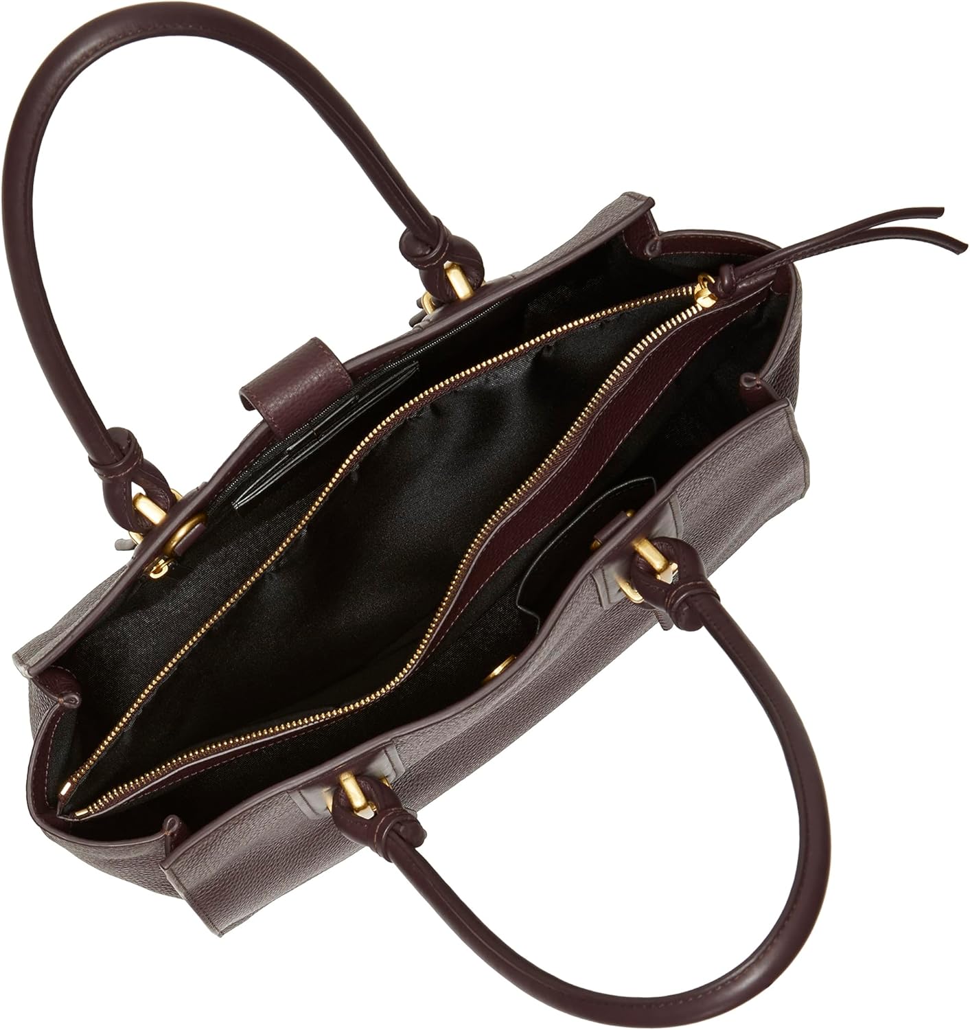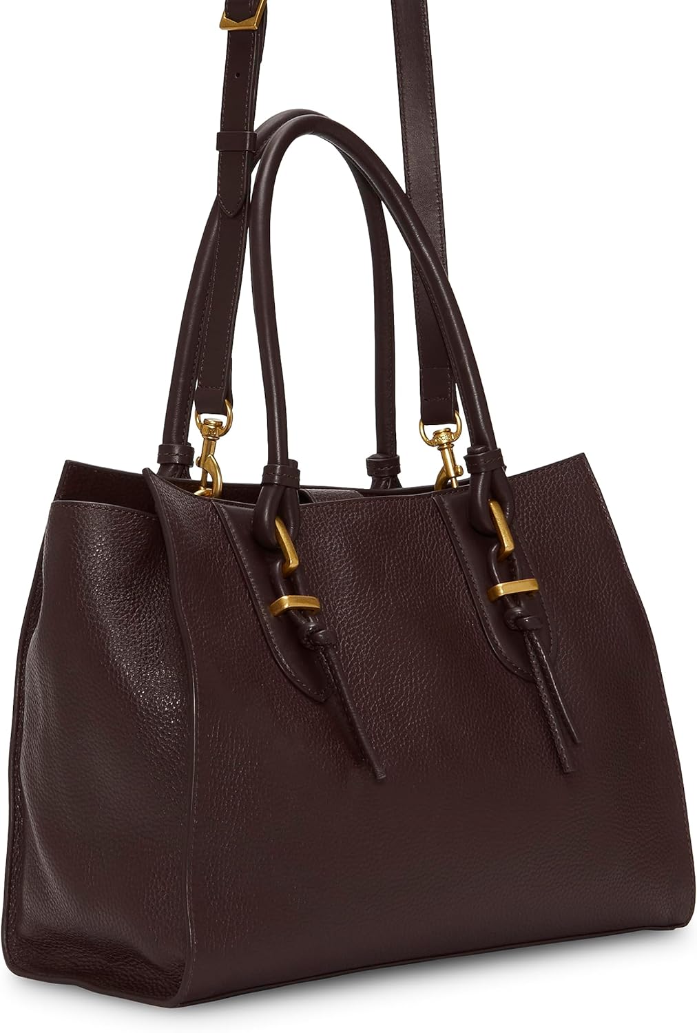 Vince Camuto’s Maecy Tote in exquisite, soft pebbled leather features brush gold hardware and knotted leather detailing. A spacious interior with enhanced organization features a center zip compartment and additional zip and slip pockets as well as credit card slots. This must have piece can be worn over your shoulder with dual rolled handles or opt for the adjustable cross body strap whether traveling to work or around the world. Easily store your laptop and combine effortless style with convenience and function