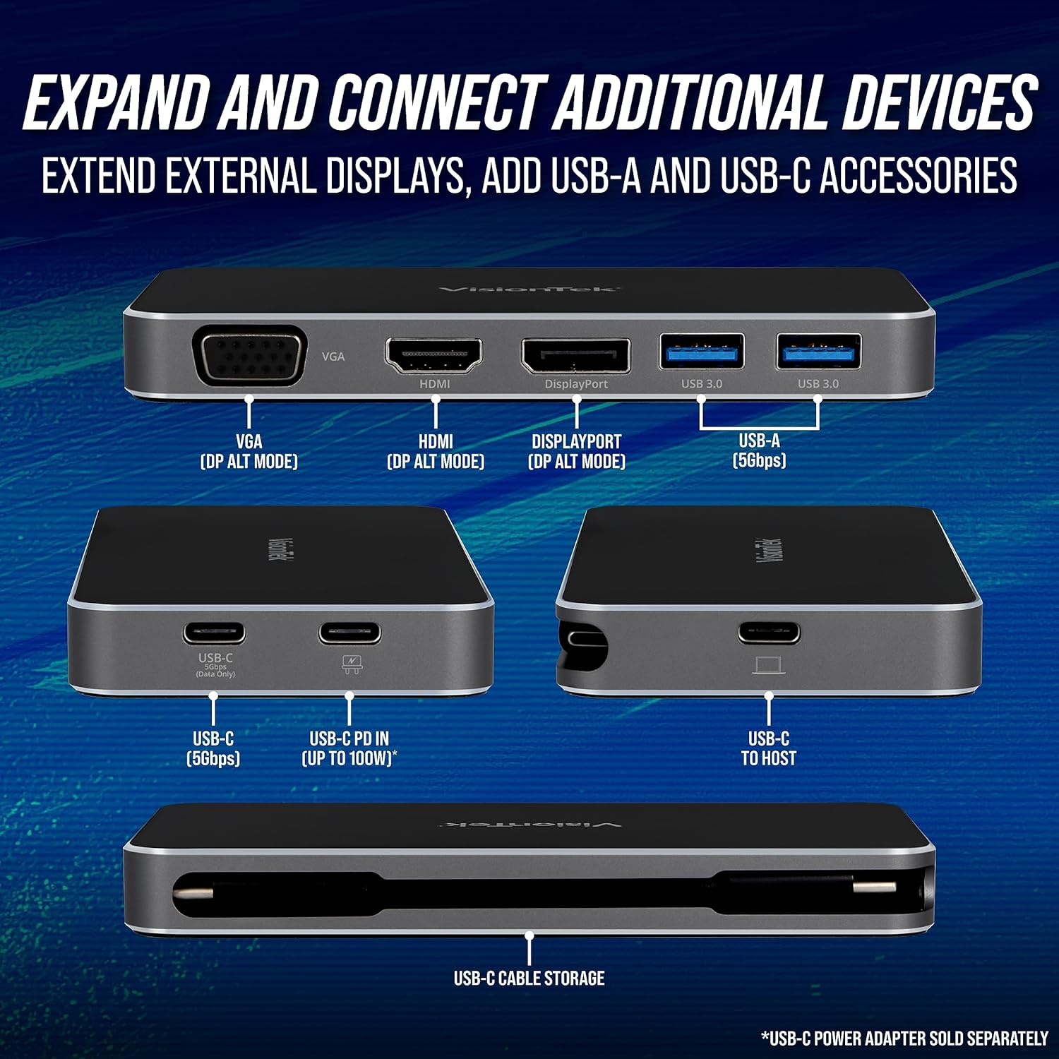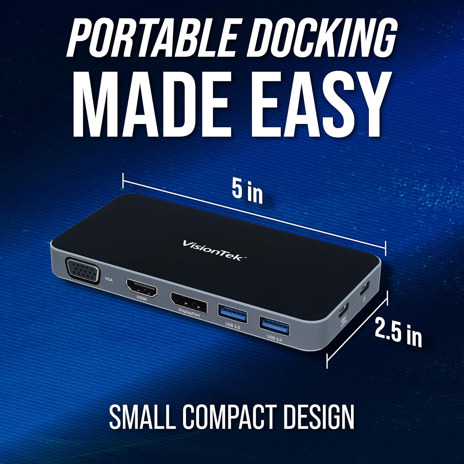VisionTek VT210 Portable USB-C Dual Monitor Hub – 1x DP, 1x HDMI, 1x VGA, 2X USB-A Ports, 1x USB-C for Windows/MacOS/ChromeOS/iOS