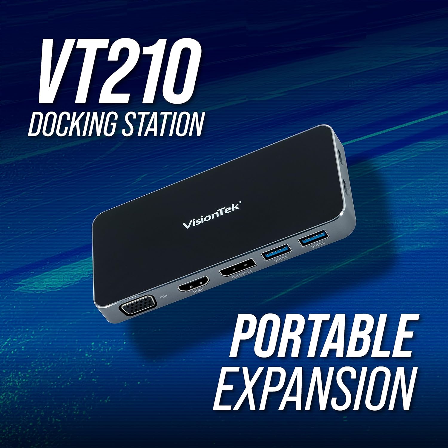 Increase your productivity with our plug and play Power Passthrough docking station, the VisionTek VT210 USB-C Docking Station for Windows™, Mac™ and Chrome™ laptop systems. With a single USB-C connection, you can connect up to two external displays, transfer files and data at up to 5Gbps speeds, charge mobile devices and your laptop.,With a single USB-C connection, you can connect up to two external displays, transfer files and data at up to 5Gbps speeds and charge mobile devices. Connect a USB-C power supply and passthrough up to 100W to your laptop.,Supports up to 3 Displays (HDMI, DP or VGA) via DP Alt Mode,USB-C connection to host system,1x DP, 1x HDMI, 1x VGA, 2x USB-A Ports, 1x USB-C 5Gbps Data Port,100W Power Delivery Supported, Power Supply not included