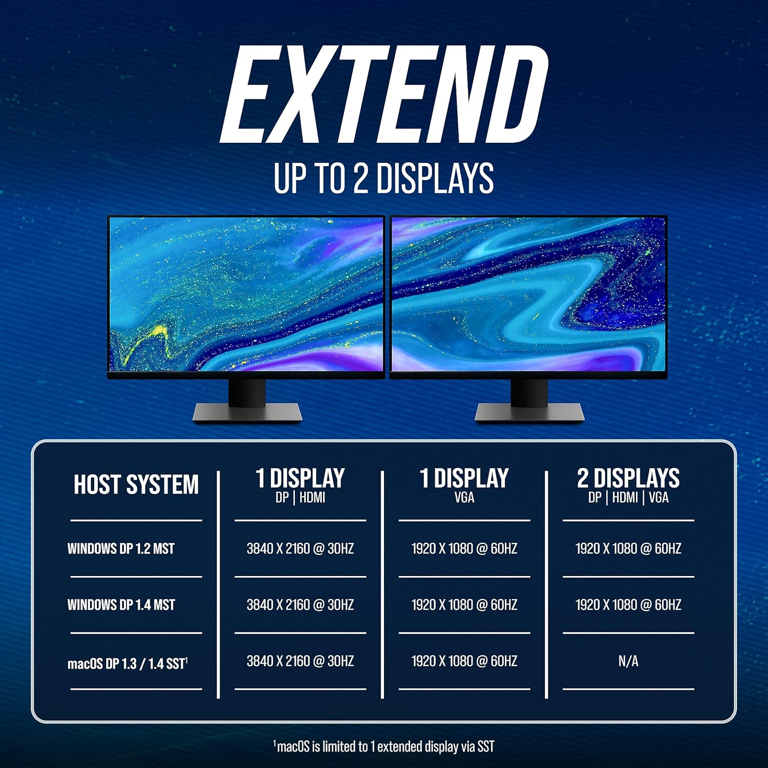 DUAL DISPLAY SUPPORT: Offers connections for up to two external displays via HDMI, DP, or VGA through DP Alt Mode, enhancing multitasking capabilities.