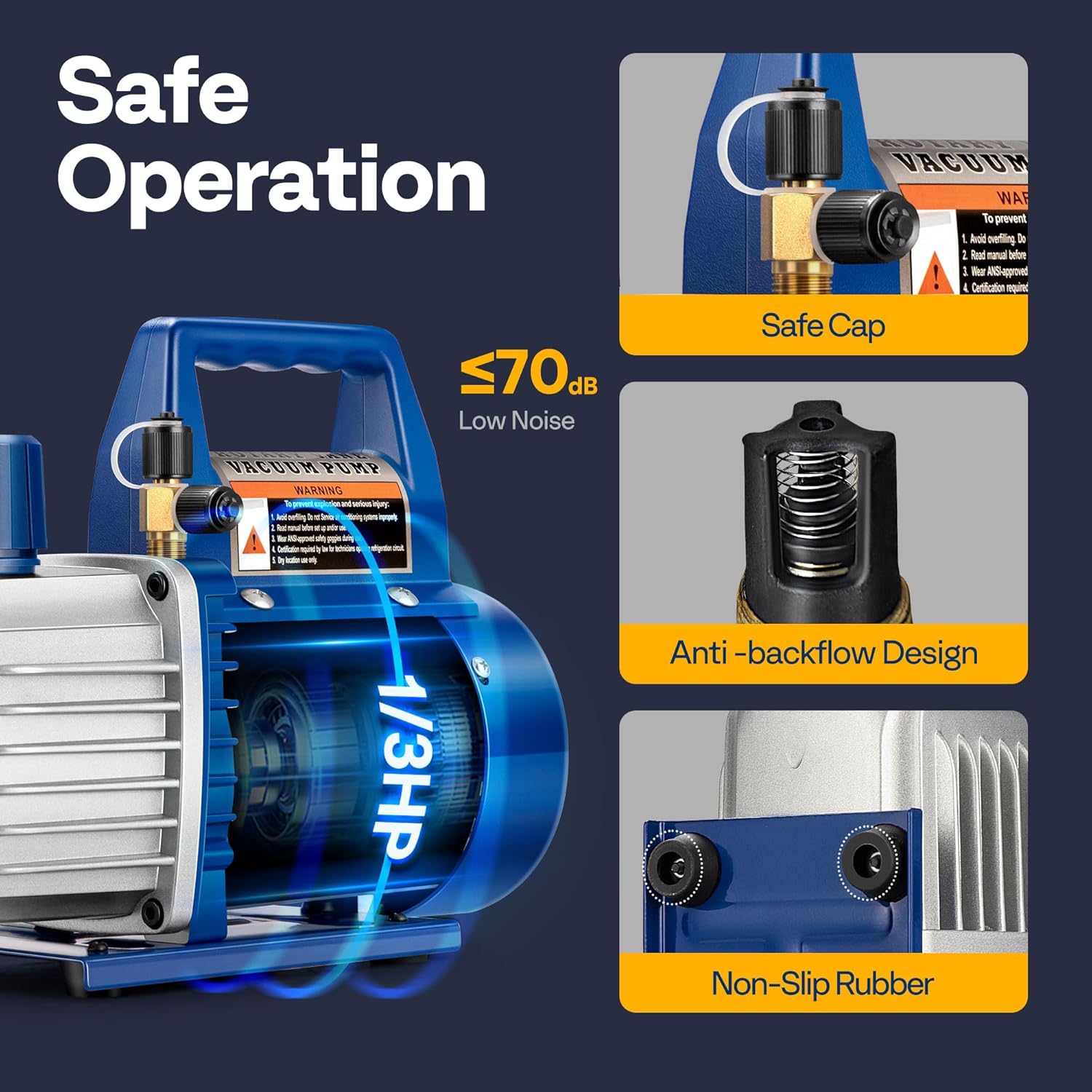 SAFE AND QUIET OPERATION – This vacuum pump has coarse particles installed in its air intake port to prevent dust particles from entering the pump chamber; Additionally, it features an anti -backflow design to prevent oil backflow, ensuring its safe operation; The cotton filter in exhaust port separates oil mist from exhaust gases, improving filtration efficiency, and also helps reduce the working noise to below 70 dB