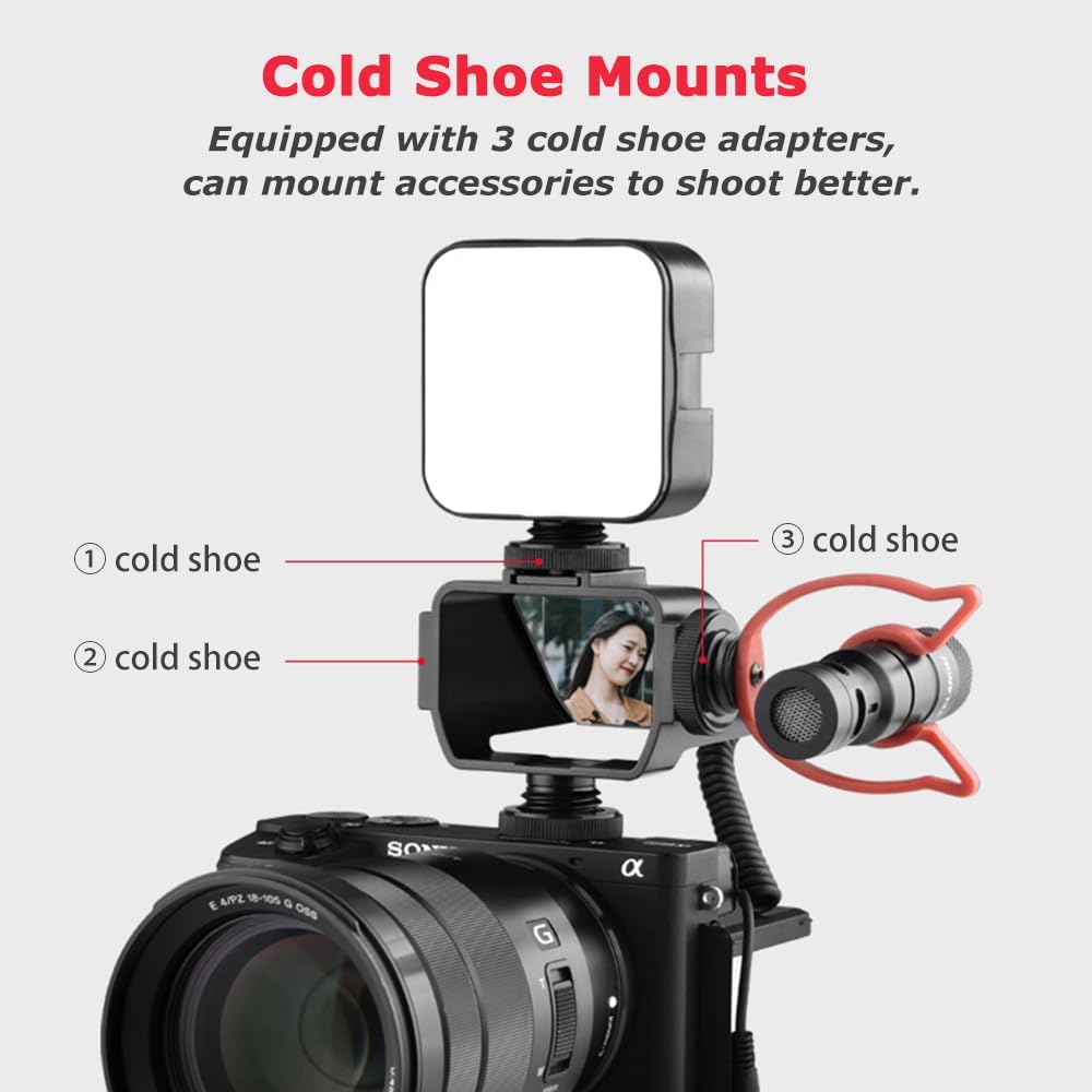 【Cold Shoe Mounts】Equipped with 3 cold shoe adapters on the top and sides, can be used to mount accessories such as microphones or fill lights to help you shoot better video effects.