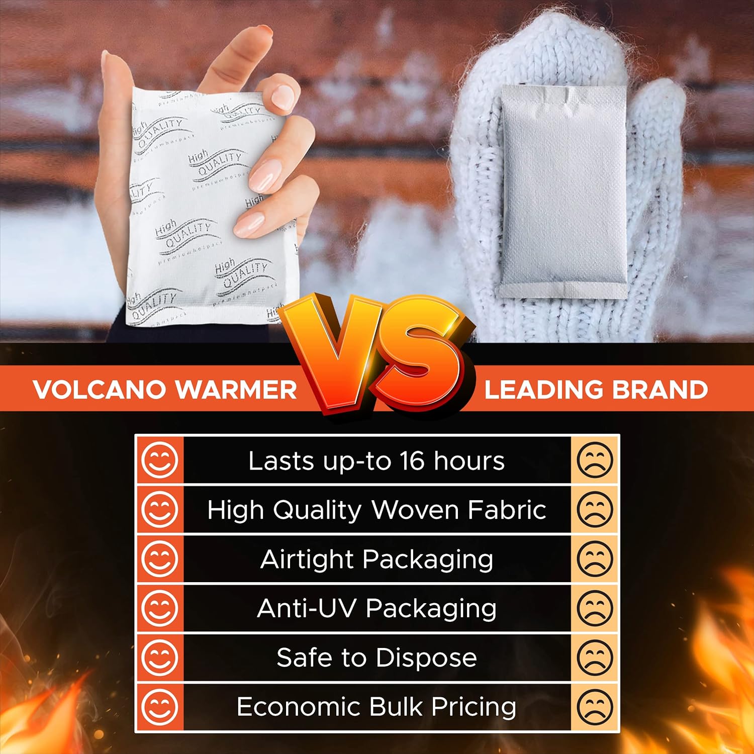 Long 16-Hour Lasting VOLCANO premium disposable hand warmers provide continuous warmth – Thanks to generous 70 grams of top-quality material. A single pack is suitable for all-day use, unlike most heat warmers only last for 4 hours. Our proprietary recipe ensures that the temperature stays below 158F degrees for added safety