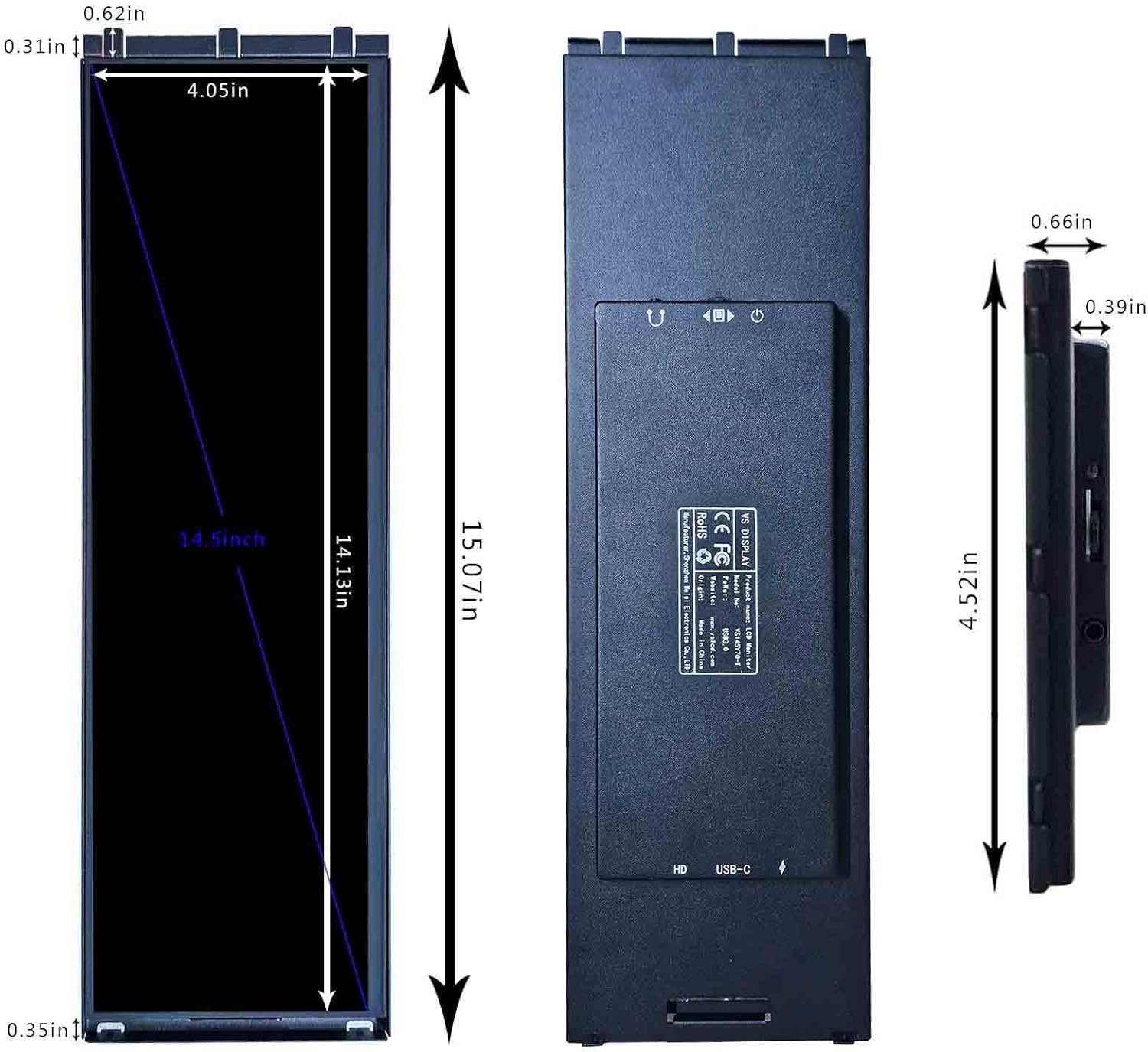 Screen Size 14.5inch Outline Size 366×115×11(H×V×D)mm Display Area 354.82× 99.97 (H×V)mm Screen Resolution 2560×720 Pixels Screen Brightness 350cd/m2 Screen Contrast 1000:1 View Angle 85/85/85/85 (Typ.)(CR≥10) [Left / Right / Up / Down] Response Time <8ms Video Input Type-C/MiniHD-MI Video Output Speaker Standby Model <0.3W Operating Temperature 0 degree to 45 degree Storage Temperature -20 degree to 60 degree