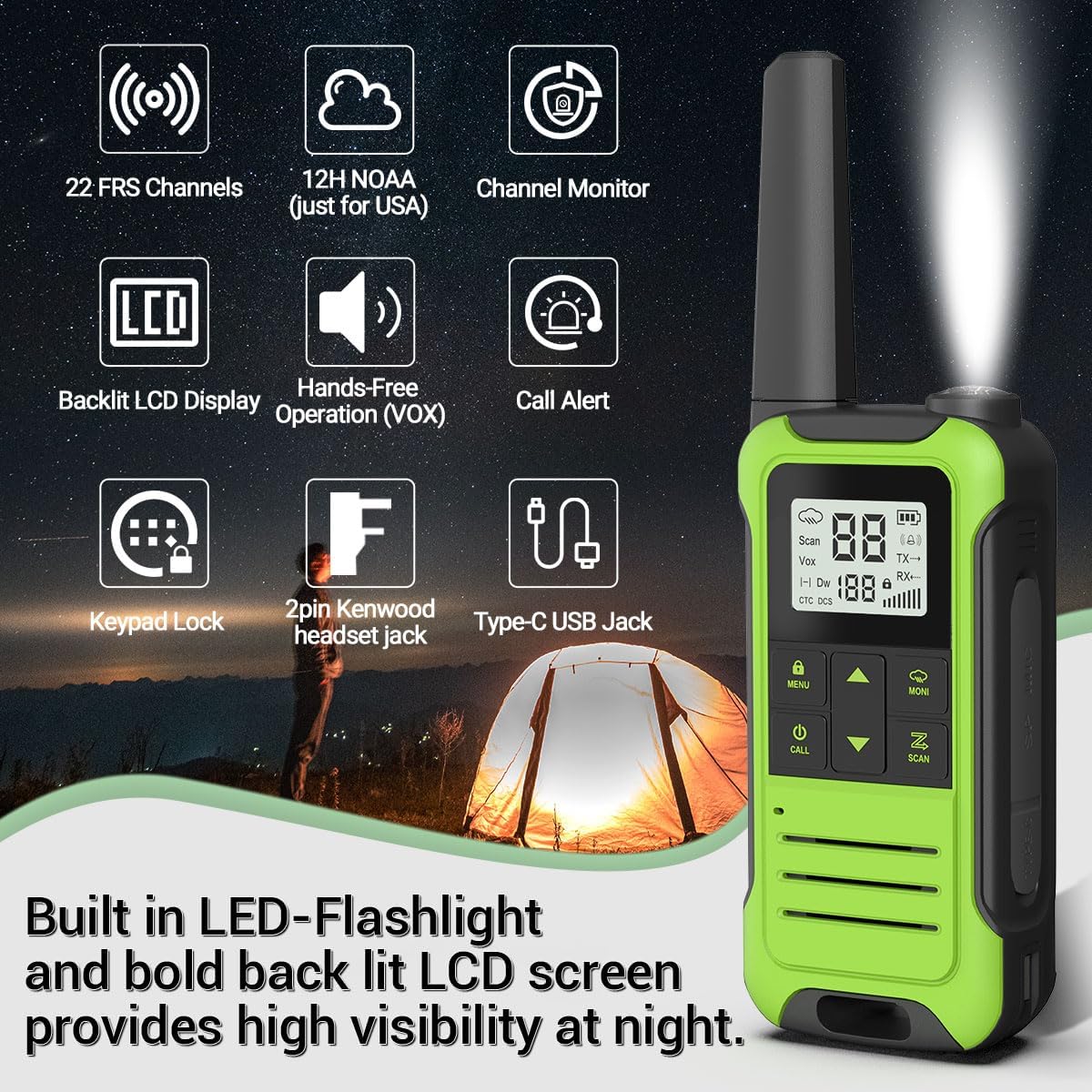 【Multi-function】The large flashlight can meet your night lighting, the portable frs two-way radio has weather alarm, which is suitable for your outdoor travel, and also has 22 channels, 12 NOAA channels, dual monitoring mode, channel scanning, 155 privacy codes, call function and 8 ring tone options, VOX hands-free function and HD audio quality, as well as Keypad Lock, Backlit LCD Display, Low Battery Audible Alert, 2Pin Kenwood headset jack, Type-C USB connector for charging.