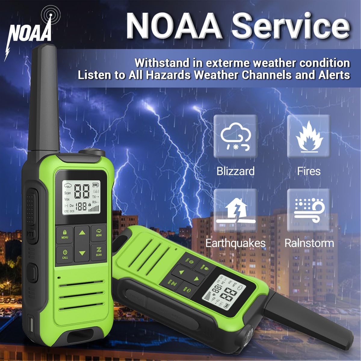 【NOAA Weather Alert】 The adult walkie talkie supports NOAA weather service. It can scan 12 NOAA Weather channels. When you turn on the weather alarm function, the two-way radio will give an alarm if there is a risk of bad weather. Gives you plenty of time to deal with disasters such as Tornadoes, Hurricanes, Thunderstorms, Floods, Earthquakes, etc. This is a necessity for life safety.