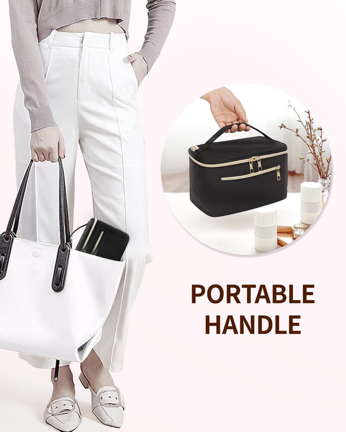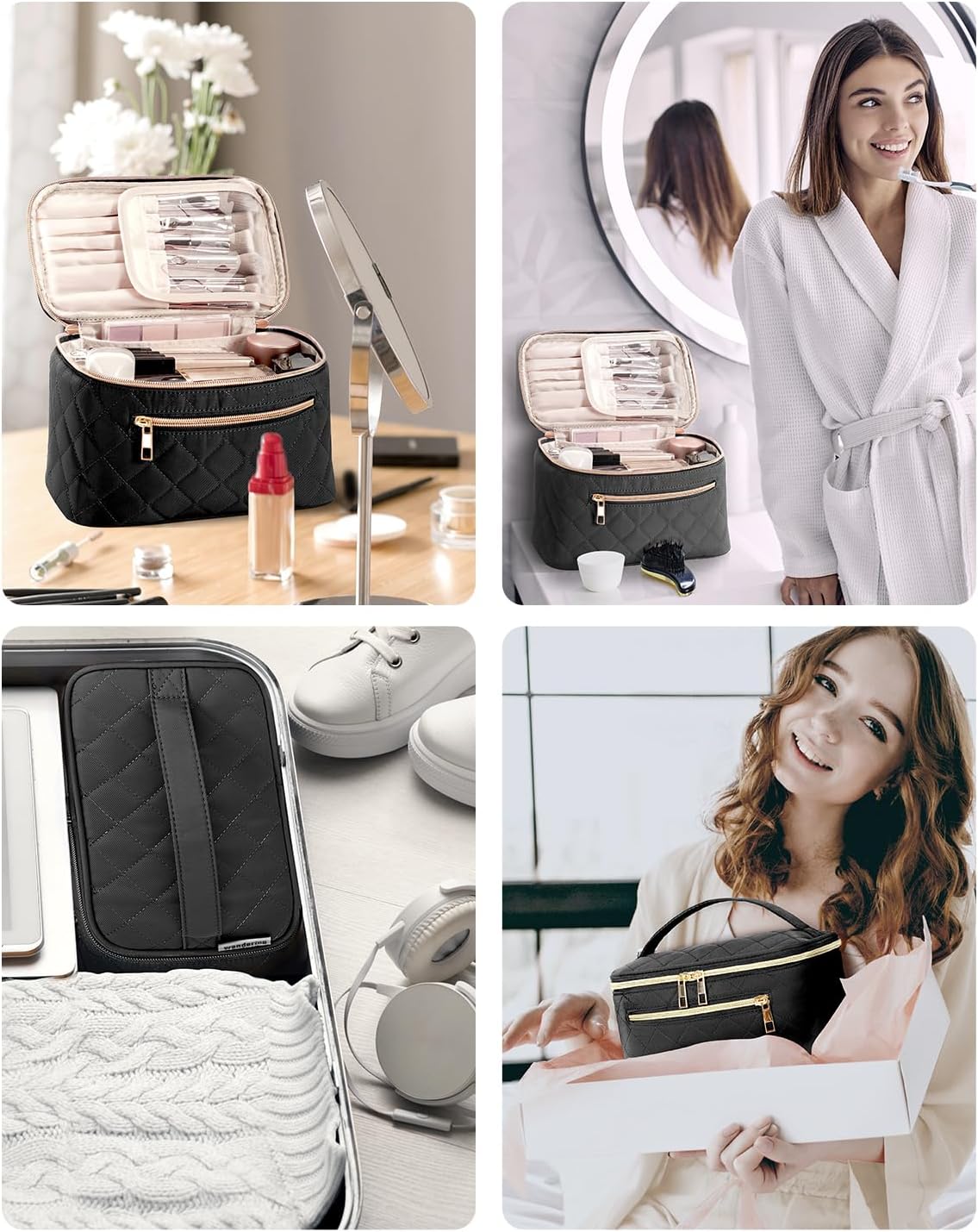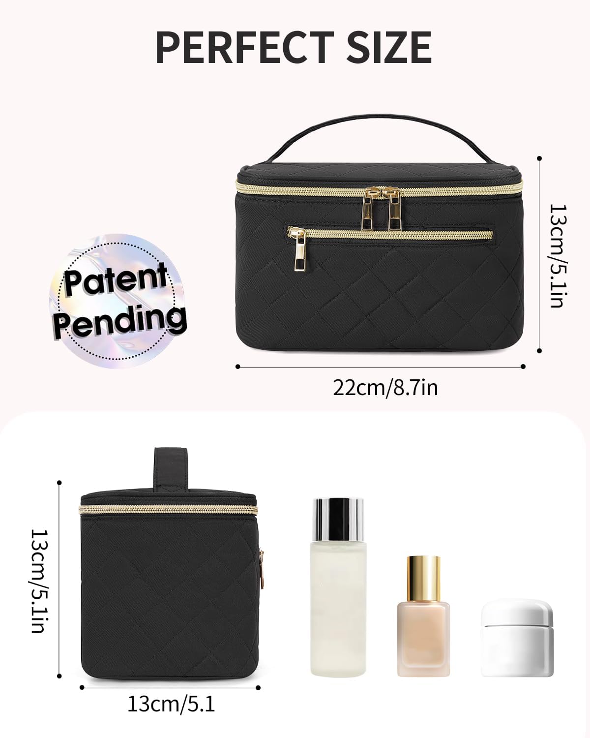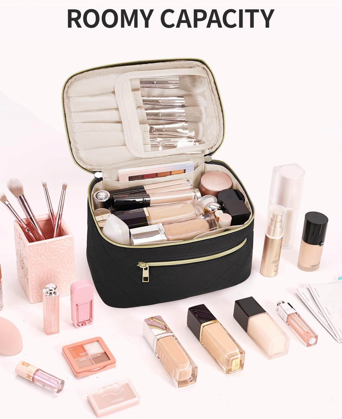 Wandering Nature Makeup Bag, Travel Make Up Organizer Cosmetic Brush Bags Case for Women in Quilted Fabric, Black(Patent Pending)