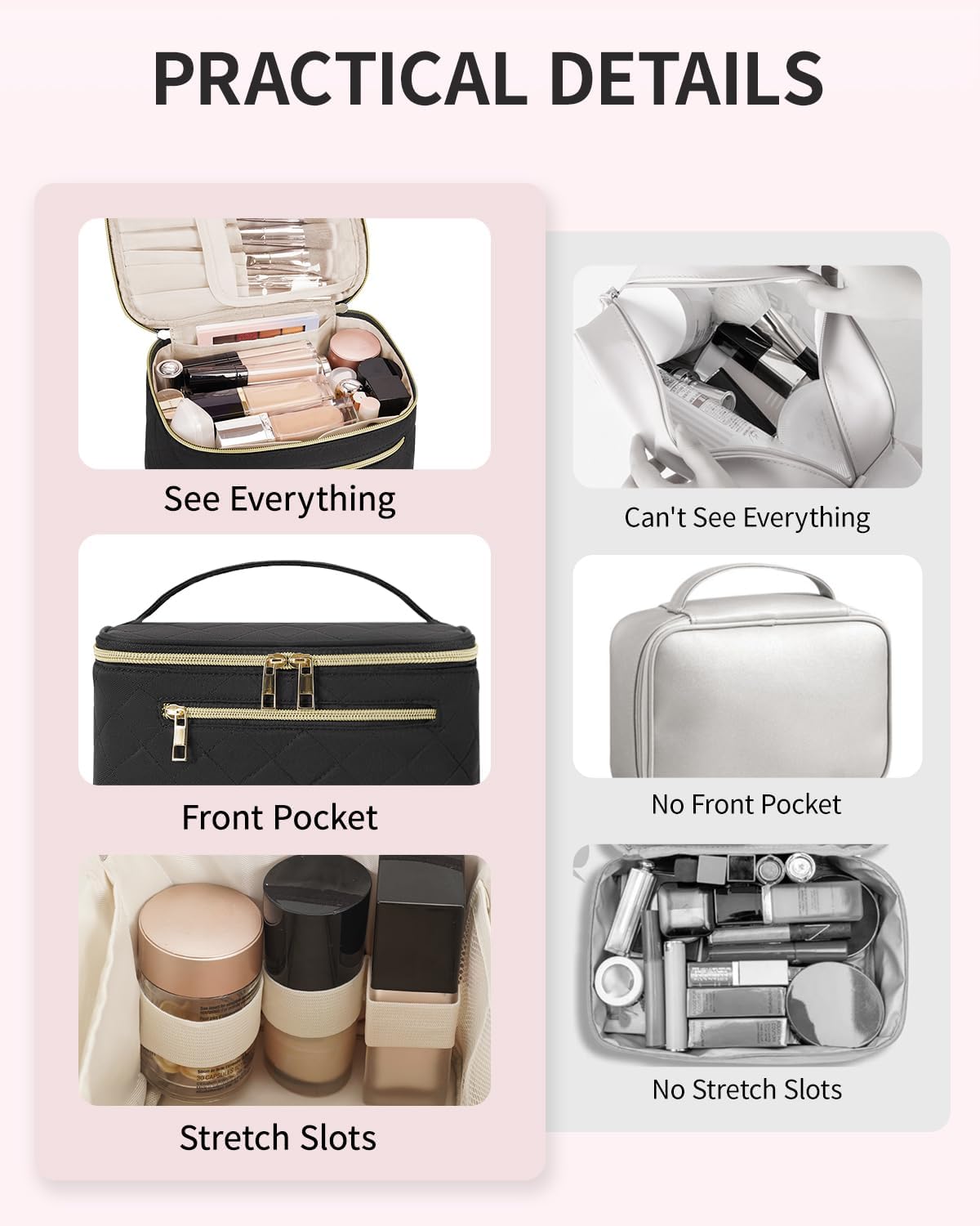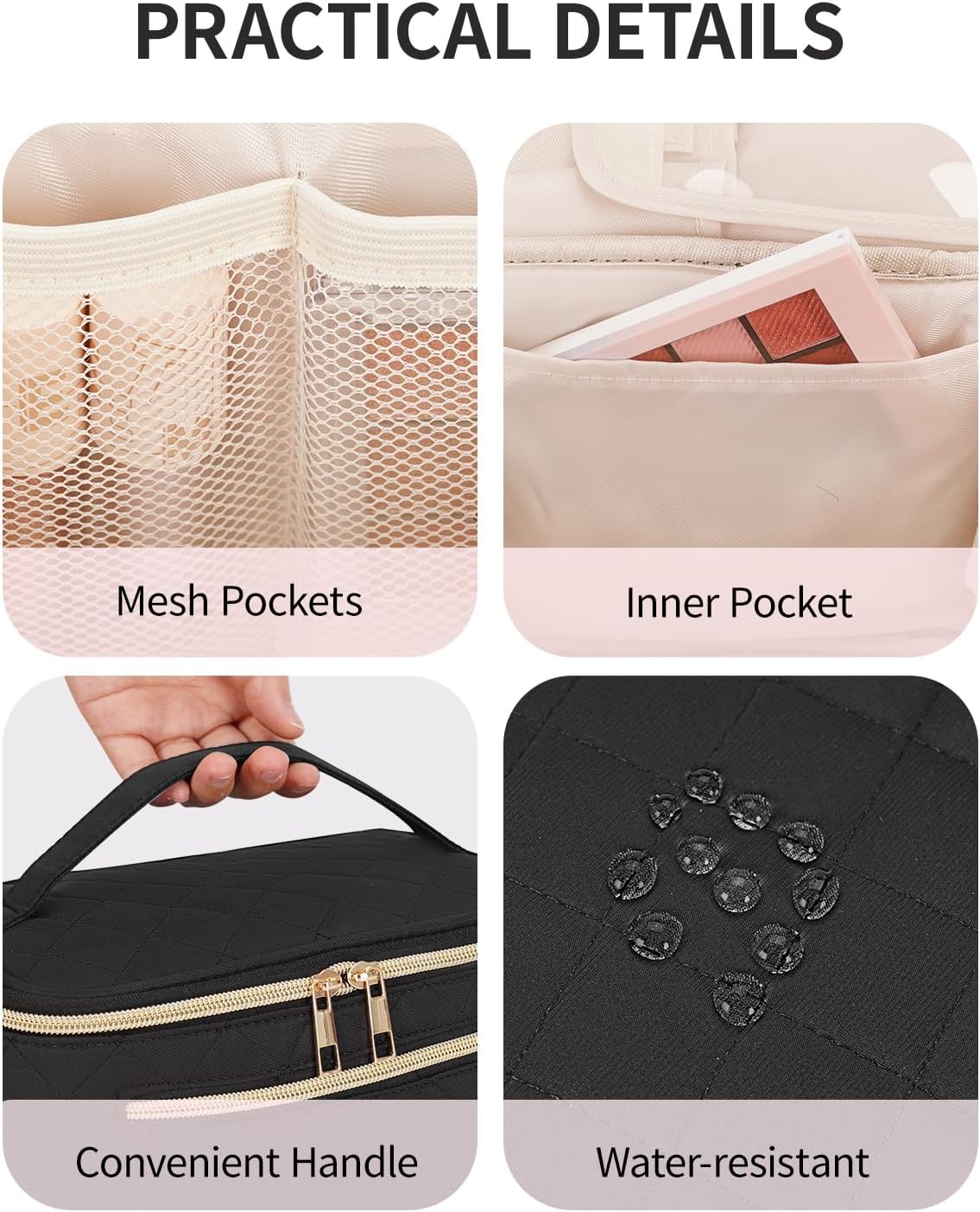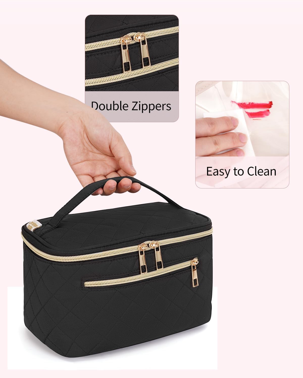 Quilted Fabric: This cosmetic bag is made of premium Quilted Fabric and has all of the comfort, softness, and water-resistant. Also, the well-padded design of makeup bag organizer provides great protection performance.