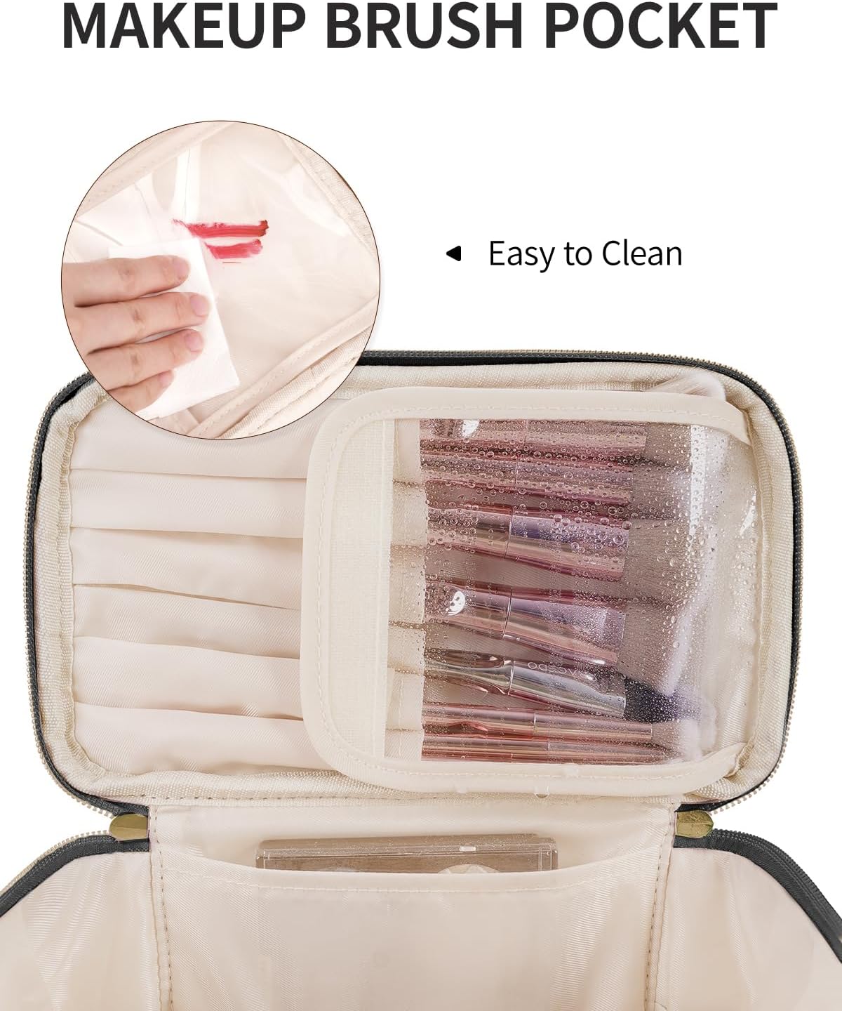 Separate Brushes Compartment: The top flap includes 6 slots with clear make up brush cover with velcro tape for storing more than 10 different size of brushes while traveling. And the clear cover is easy to clean & protect brushes from dust.