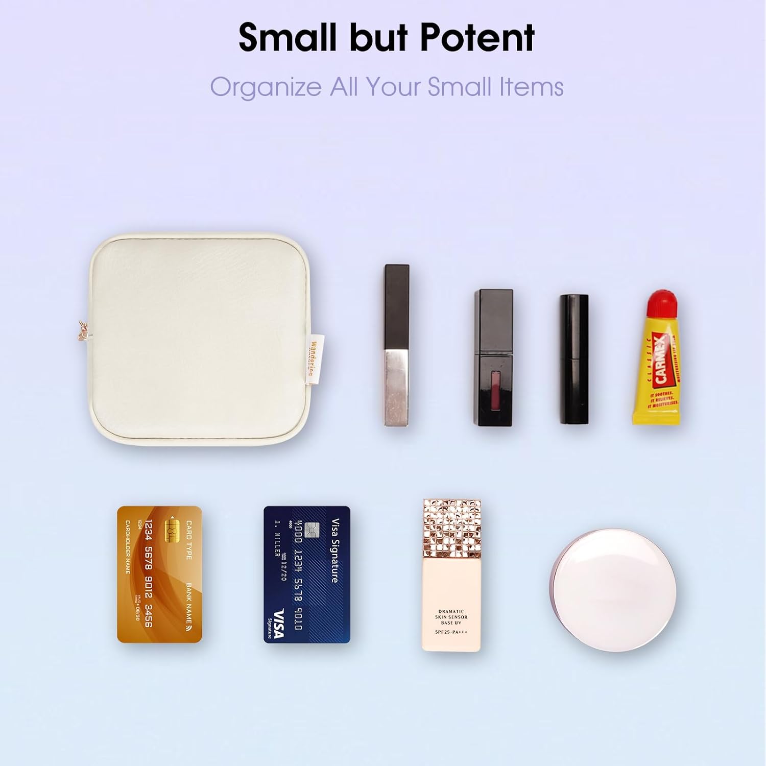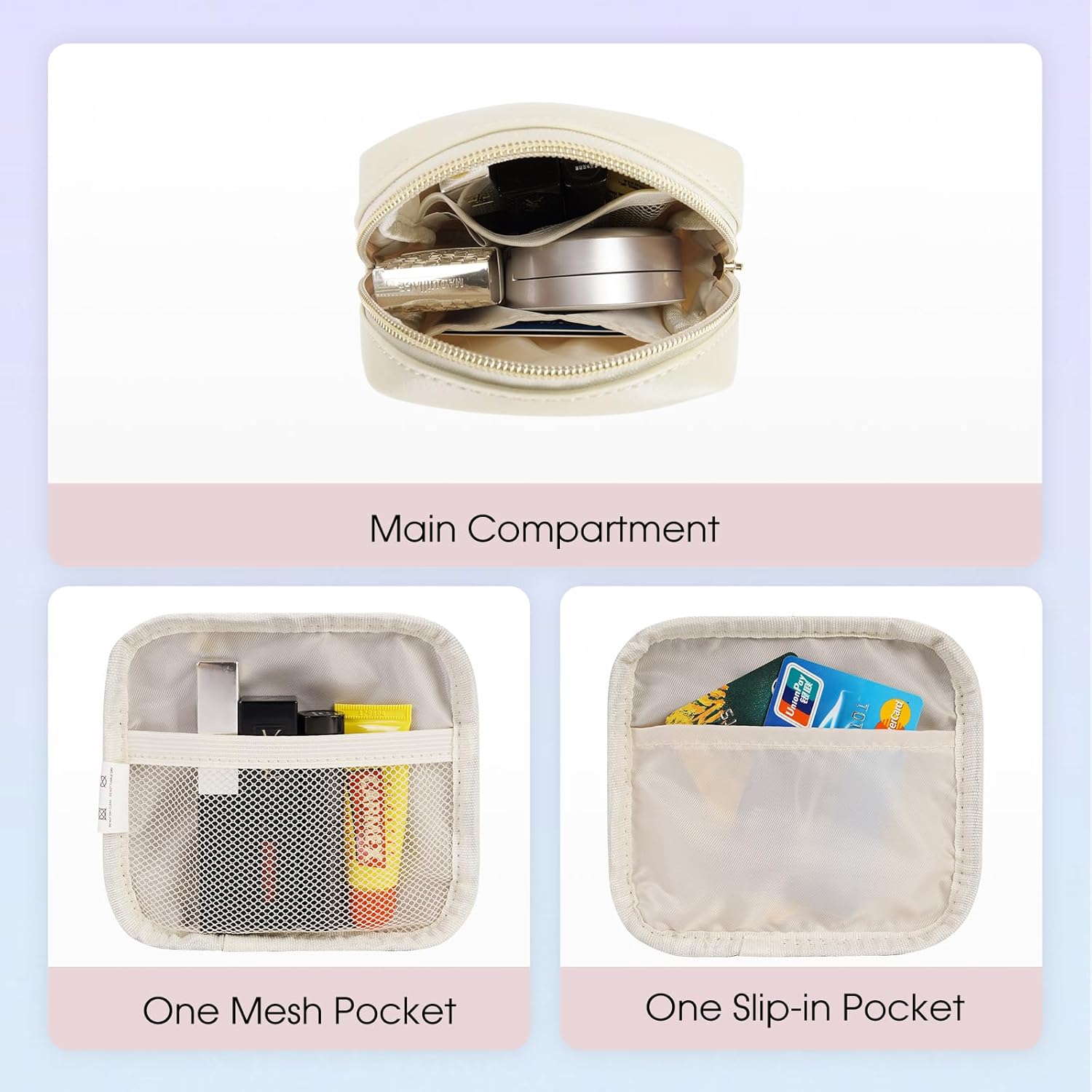 Wandering Nature Small Makeup Bag for Purse Mini Make up Pouch Cute Cosmetic Pouch for Women with Slip-in Pockets Eco Vegan Leather, Milky White