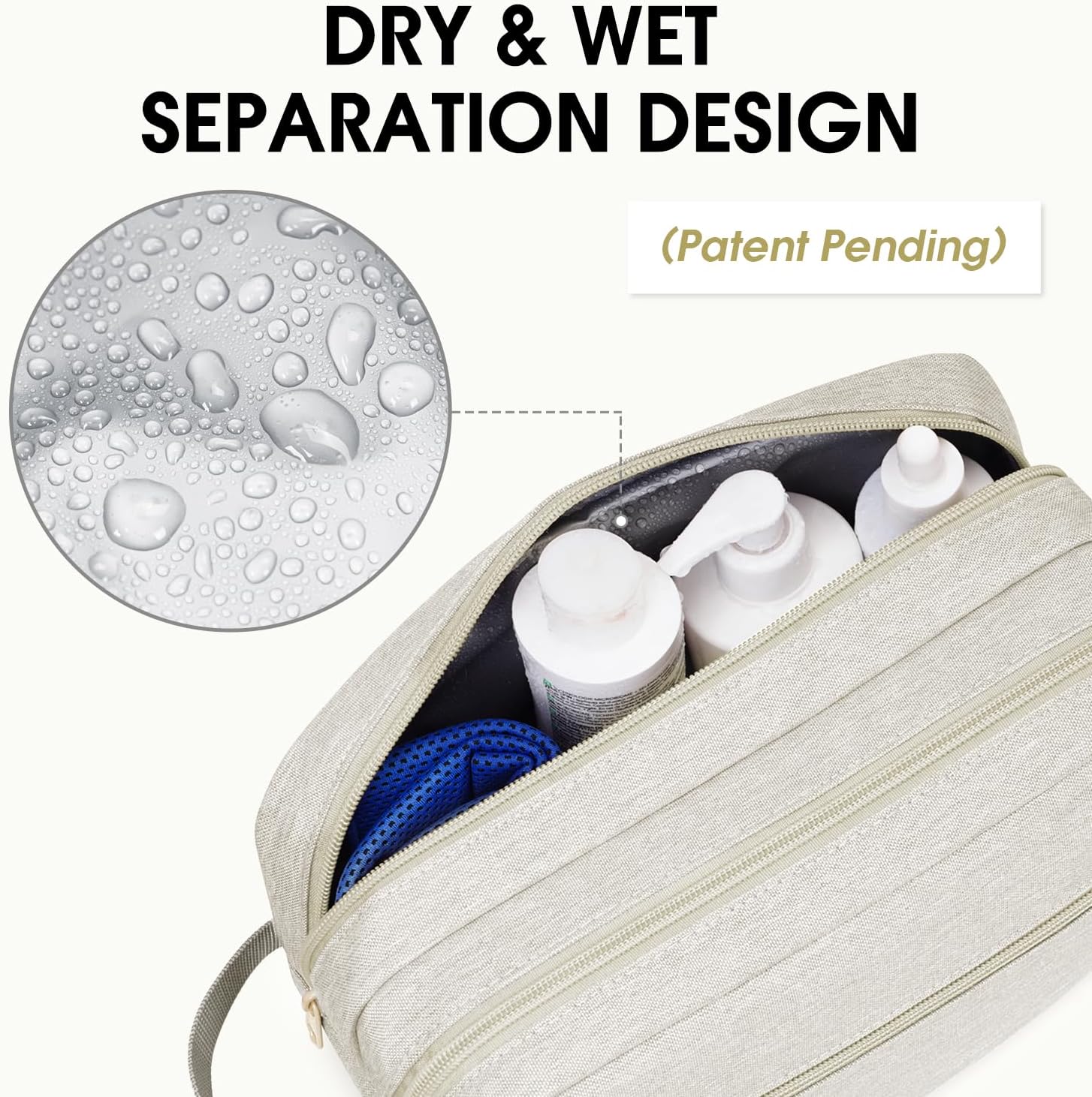 【Wet/Dry Separation】- The WANDF toiletry bag is designed with a spacious wet/dry separation area, allowing you to easily store damp towels, toothbrushes, toothpaste, spray bottles, and other toiletries while traveling, eliminating the inconvenience of mixing wet and dry items.(Patent Pending)