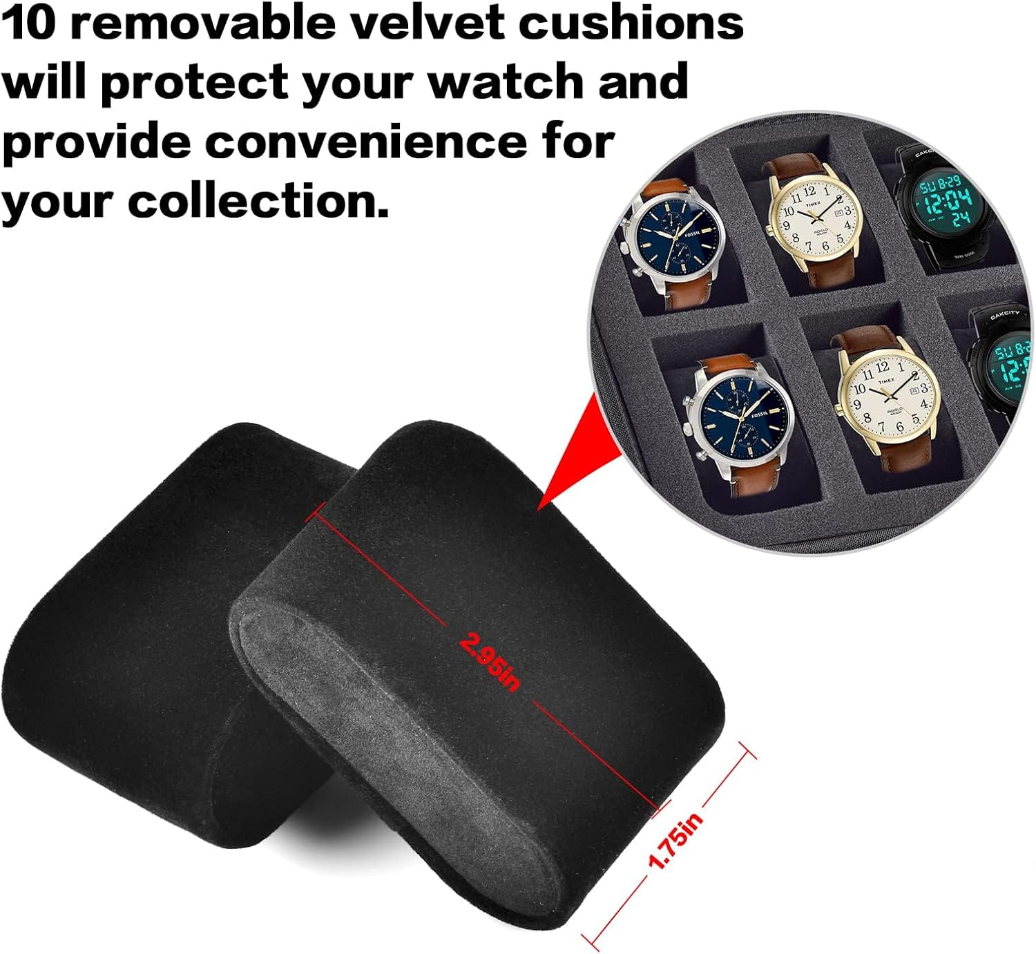 Exquisite interior structure jewelry watch organizer container: Watch holder for women have 10 removable pillows for easy rearranging of the order of mens watches, 10 compartment size: 5*9.5cm, plenty of finger space to easy to take out or put in the pillows, each pillow with soft velvet to protect women watch scratch. The excellent craftsmanship and exquisite wiring of watch roll, make watch pouch, easy to put it in drawers or luggage with ease. make your dresser neat and clean.