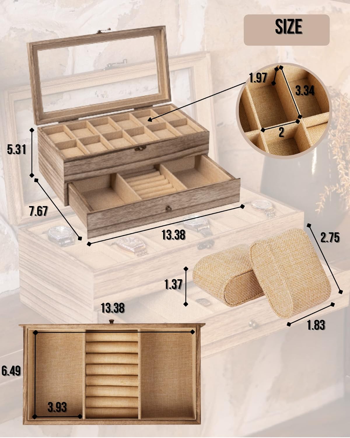 [Multifunctional Organizer] The second layer of the watch jewelry organizer is a multifunctional organizer with ample space for eyeglasses, necklaces, earrings, rings, brooches, tie clip, cufflinks. The brass retro lock can be easily opened with only one hand, making it breeze to take out your items and keep your desktop tidy