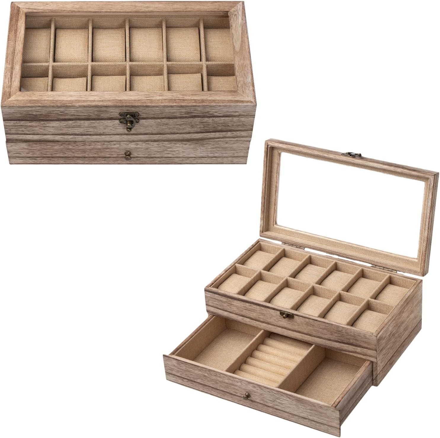 Watch Box, Watch Case for Men Women with Large Glass Lid, Wooden Watch Display Storage Box with 2 – Layers & 12 – Slots, Wood Mens Watch Box Organizer for Gift