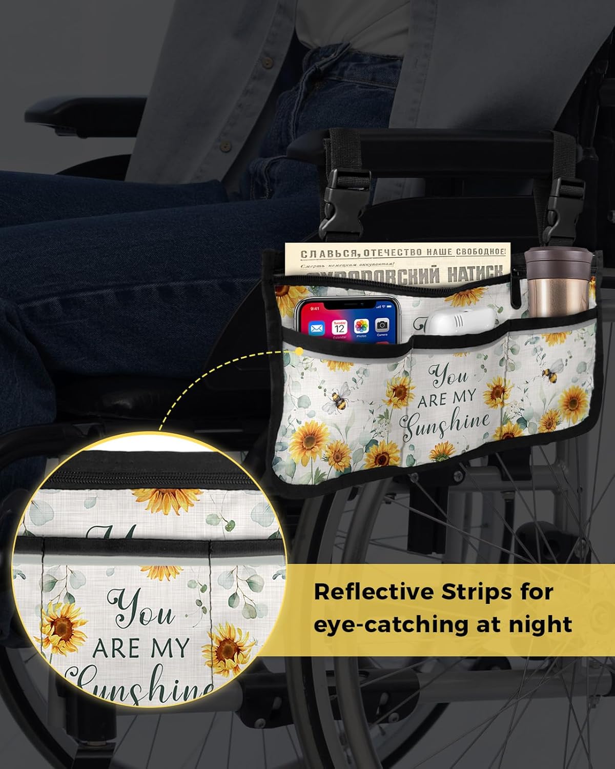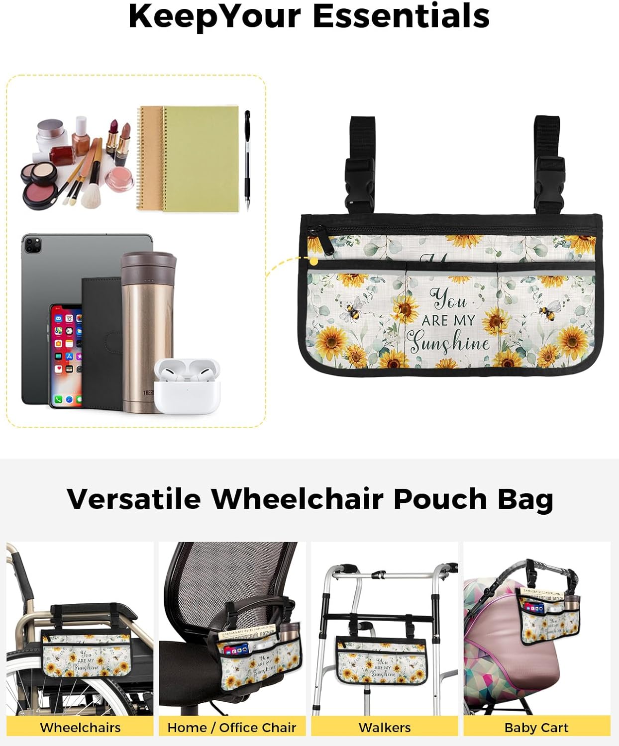 Wheelchair Bag, Sunshine Spring Summer Sunflowers Eucalyptus Leaves Floral Plants Bees Country Beige,Armrest Accessories Storage with Adjustable Straps for Walkers,Rollators,Set of 1, 7.3×13 Inch
