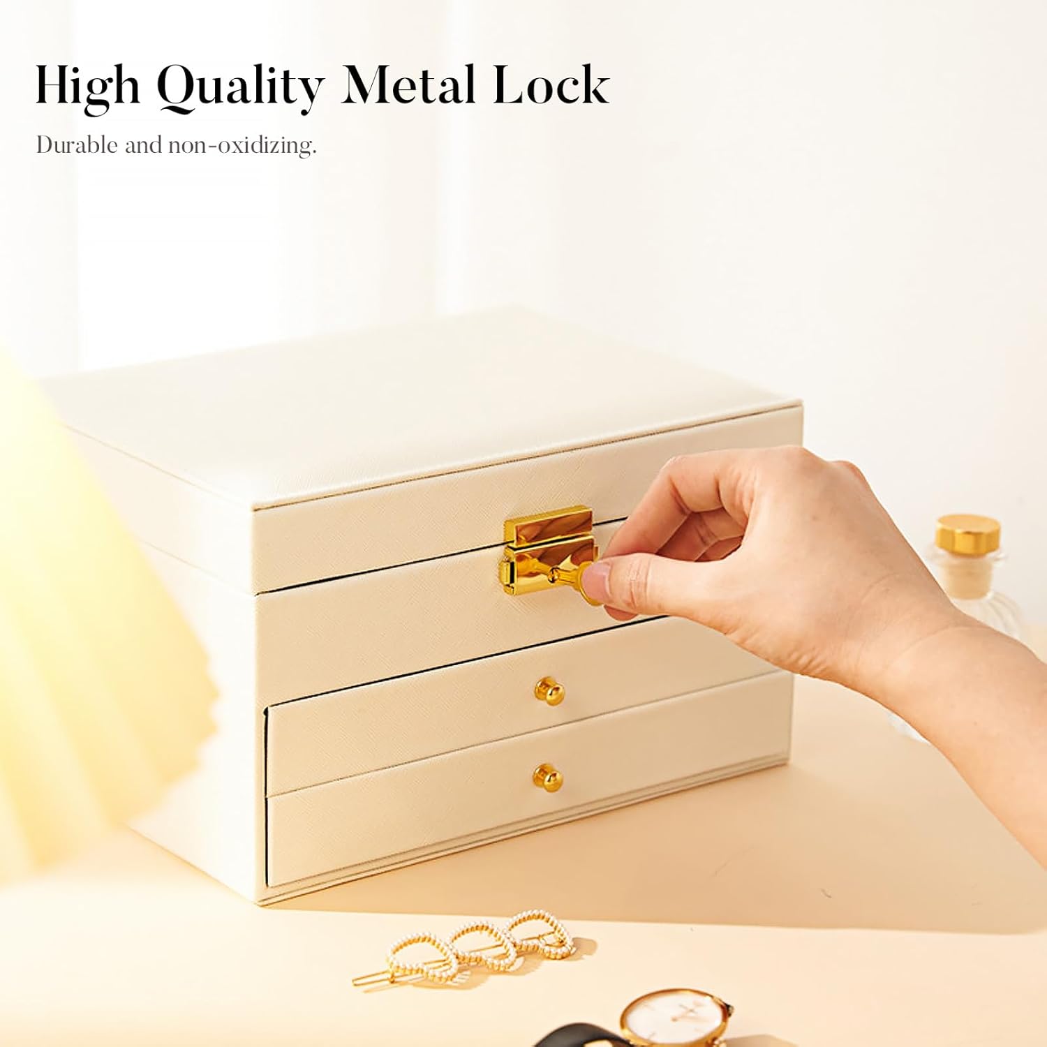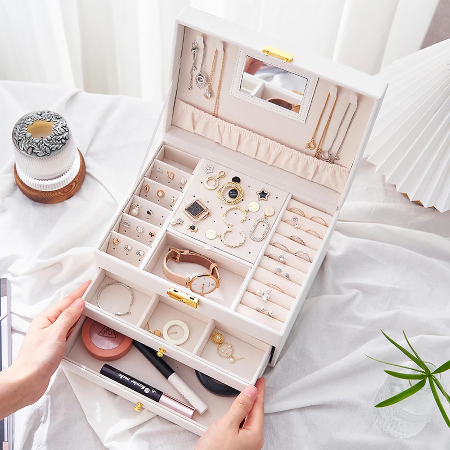 【Secure Your Treasures】 – Our big jewelry boxes for women are designed to provide full protection for your cherished pieces. Each item is cradled in a soft lining within the spacious jewelry box, ensuring they stay in impeccable condition even with regular wear. Rest easy knowing that your jewelry will always look as stunning as the day you first wore it.