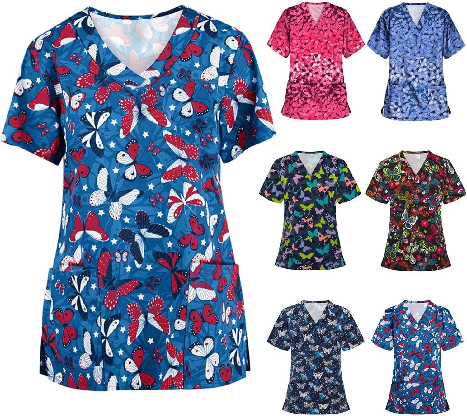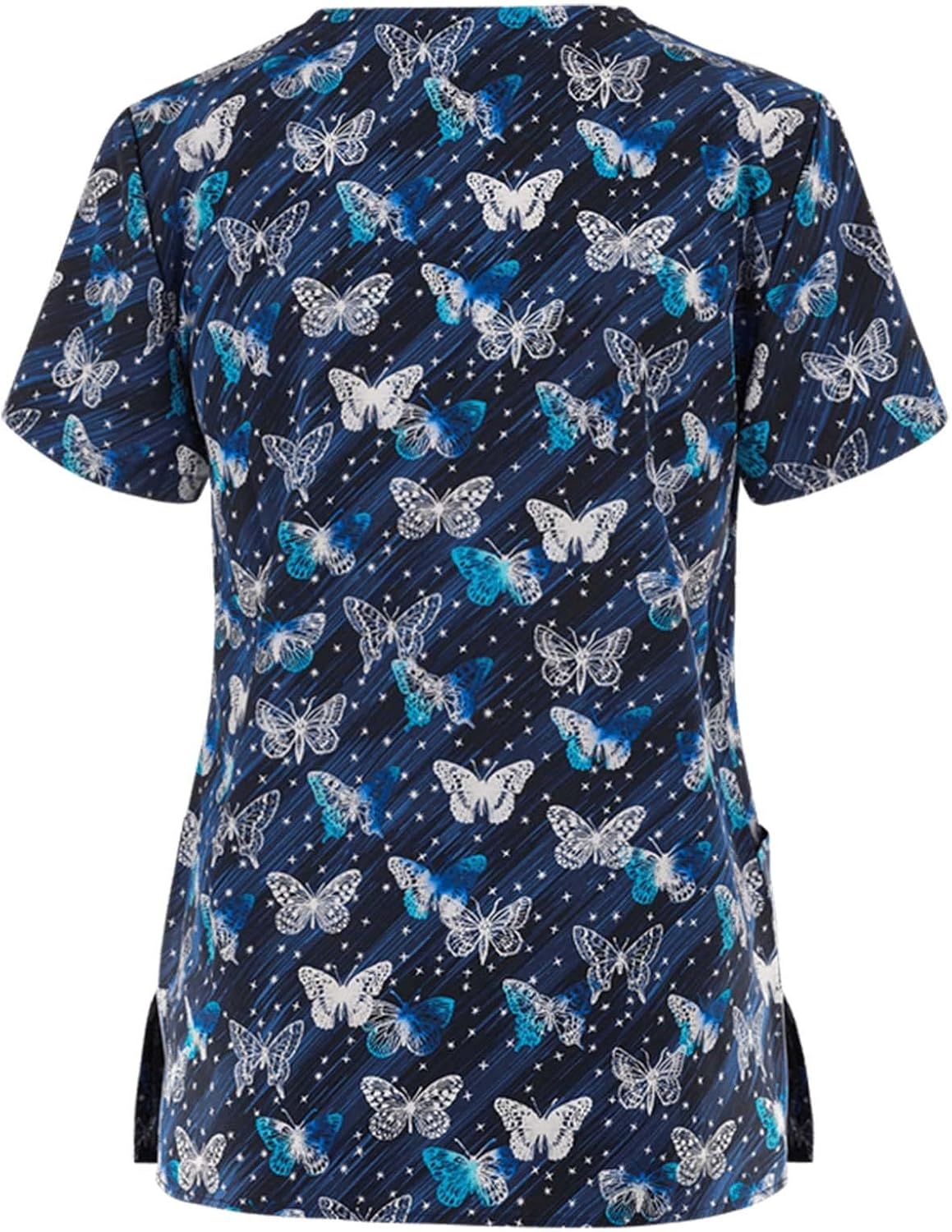 Women’s Short Sleeve Nurse Working Uniform Flowers Print V Neck Medical Scrub Tops Health Clinic Career Blouses