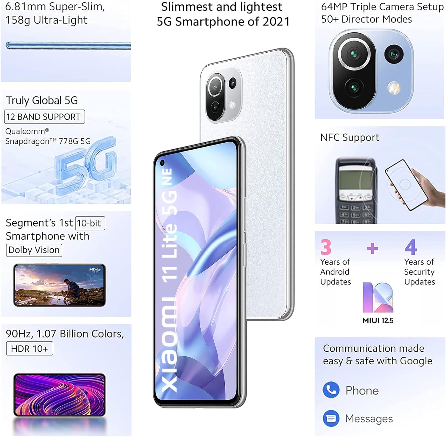 Xiaomi Mi 11 Lite 5G NE Unlocked Cellphone, 5G + 4G LTE Volte Smartphone,8GB + 128GB,White