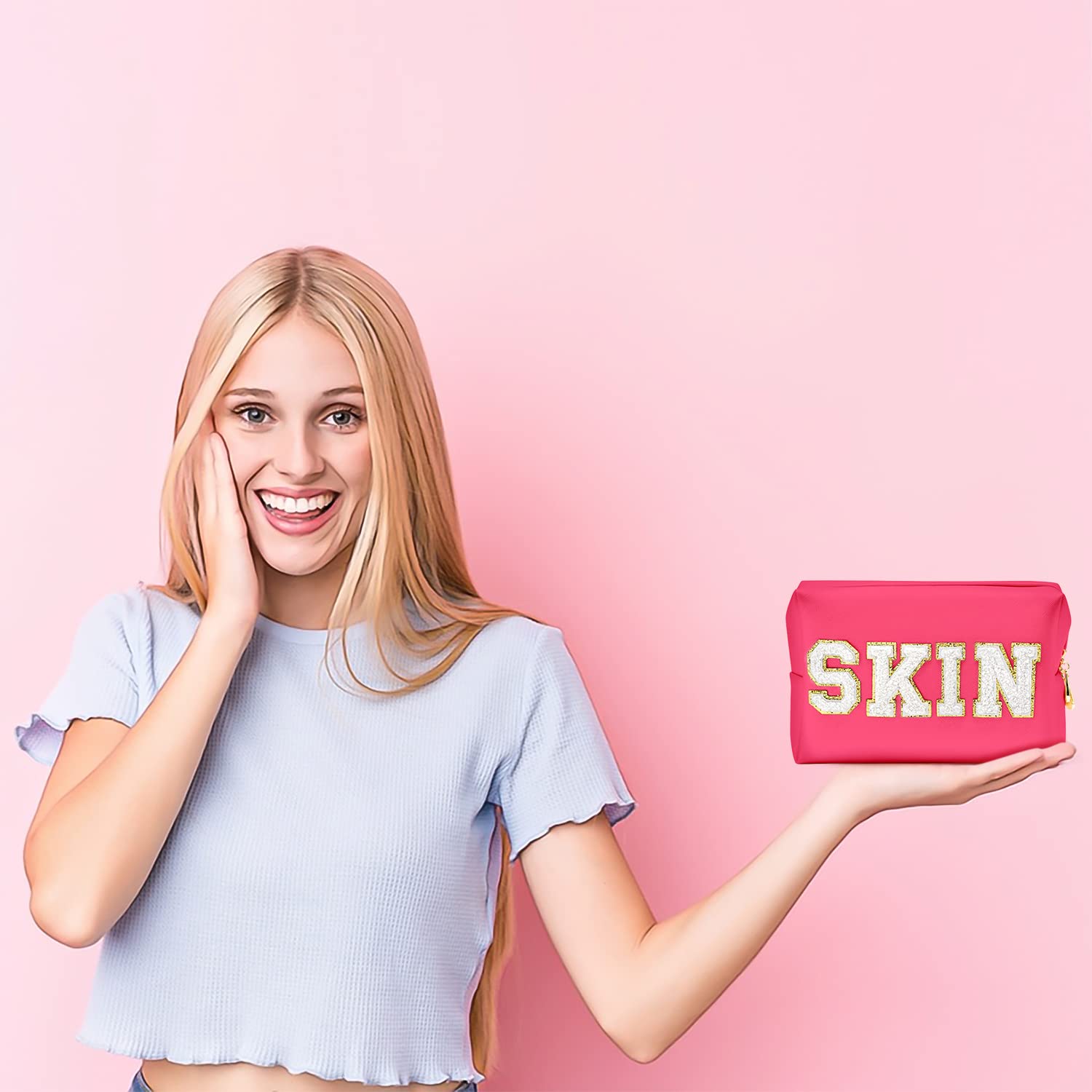 Y1tvei Preppy Patch SKIN White Letter Cosmetic Toiletry Bag PU Leather Portable Makeup Bag Daily Use Storage Pouch Toiletry Purse Waterproof Organizer for Travel Varsity Women Girls (Rose Pink)