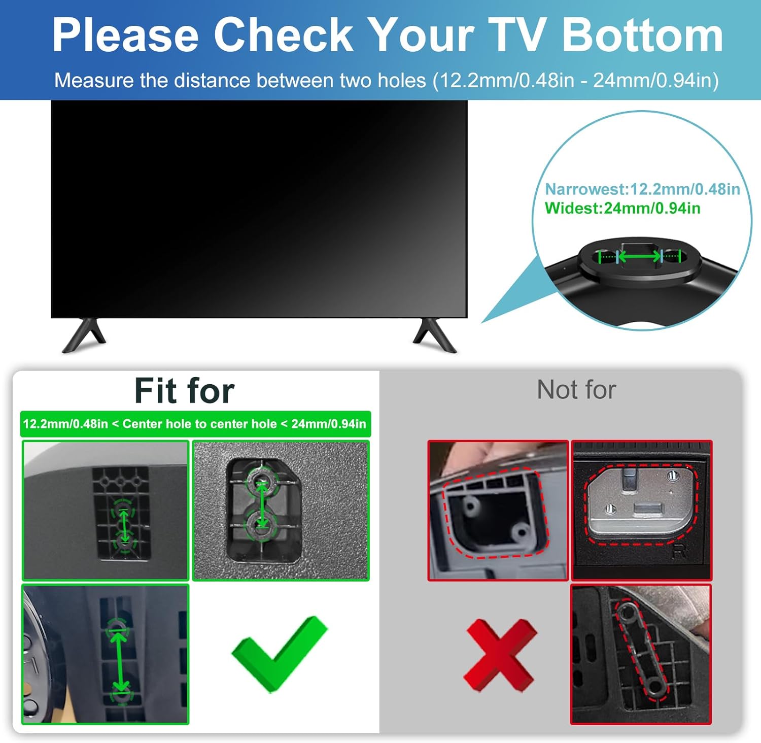 —The Appropriate Distance Between Hole Centers— Due to the various shapes of the bottom mounting holes of the TV, please measure and ensure the dimensions are appropriate before purchasing (Kindly check picture-2). Our bracket is suitable for hole center spacings within the range of 12.2mm/0.48in to 24mm/0.94in.