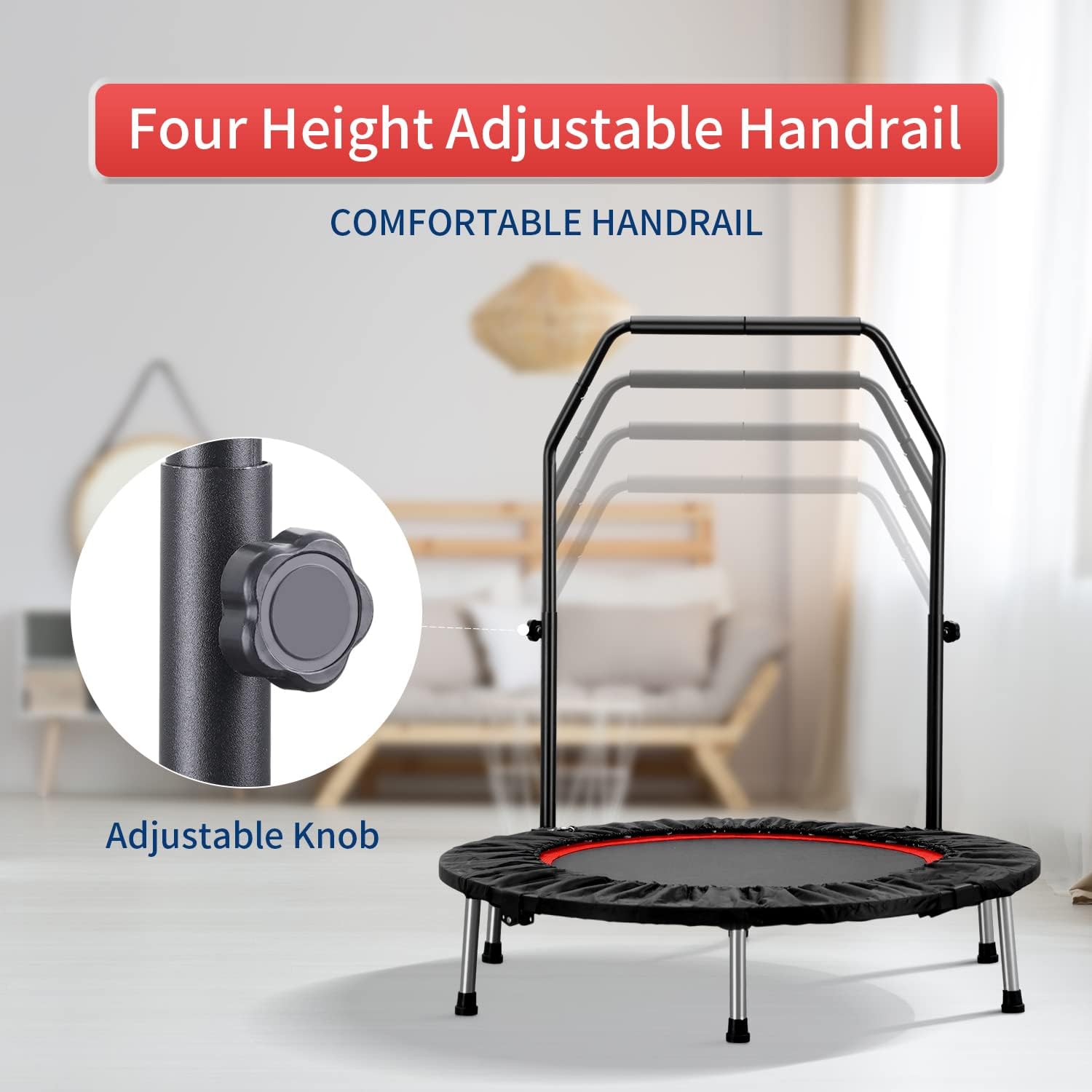 【Height Adjustable】: In addition to ensuring safety, the handle bar is adjustable, providing FOUR levels ranging from 32.7-41.7 inch (on the mat). So the rebounder can be used for both adults kids. Covered with foam material, The user can enjoy comfortable feelings when they do workouts that need to grip the handle, more stable and safer.