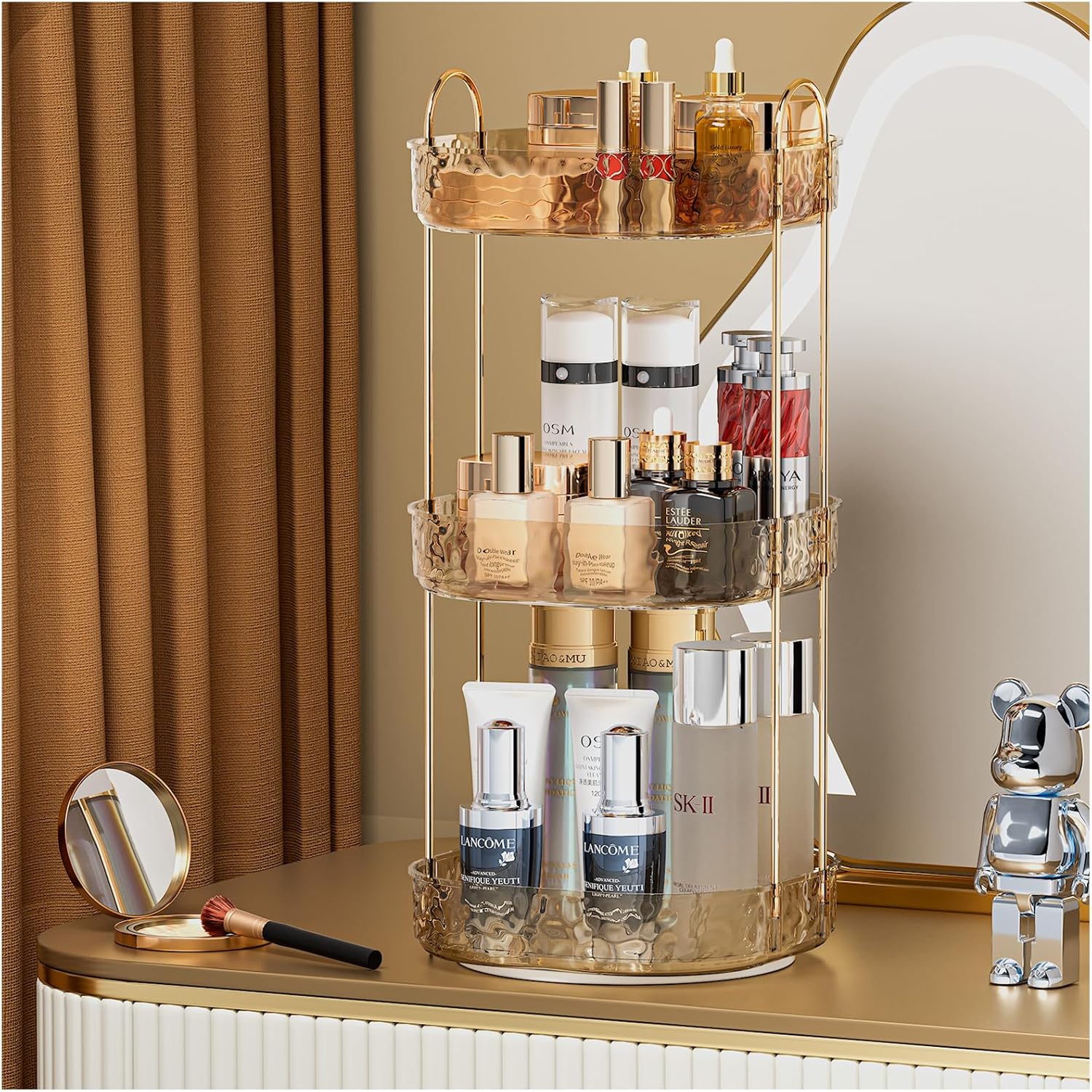 ZHIAI 360 Rotating Makeup Organizer, Bathroom Make Up Spinning Holder Rack, Large Capacity Cosmetics Storage Vanity Shelf Countertop for Bathroom, Kitchen, Dresser 3 Tier Amber