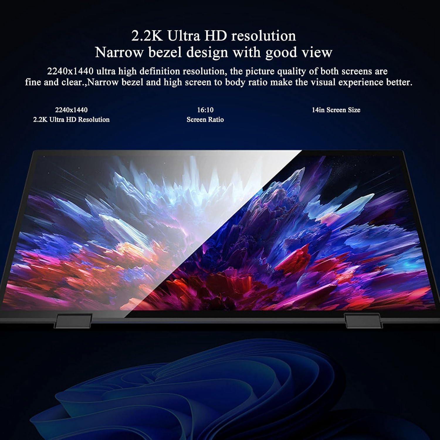 Dual Touchscreen: The laptop has a double sided 14 inch touchscreen, interconnection and interaction, a larger operating area, convenient and efficient.