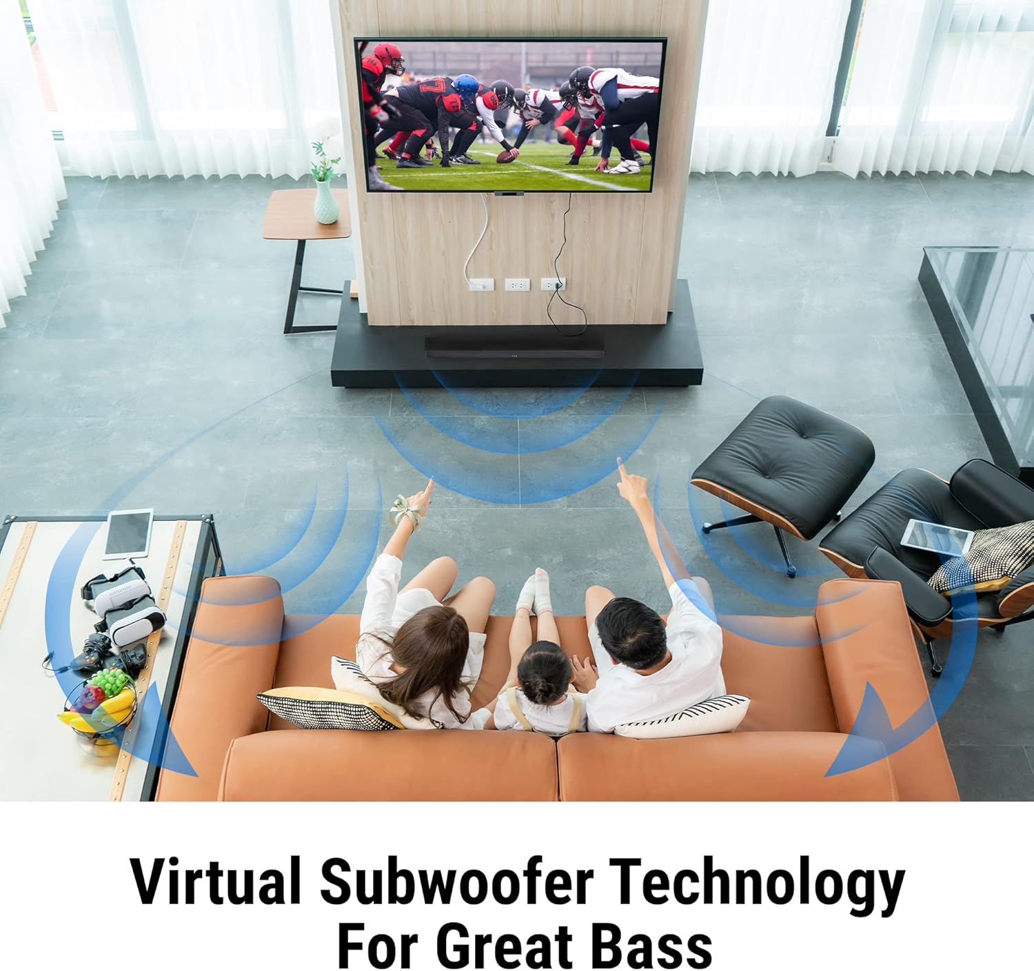 SLIM SOUNDBAR FOR TV: Low profile and ultra lightweight, our slim sound bar can fit virtually anywhere! Our speaker bar takes up less space and is effortlessly moveable, making it an ideal TV speakers sound bar! This sound bar for TV uses proprietary digital algorithms that separate the voices from the rest of the soundtrack. Voices simply “jump out” of the soundtrack so you can hear them clearly.