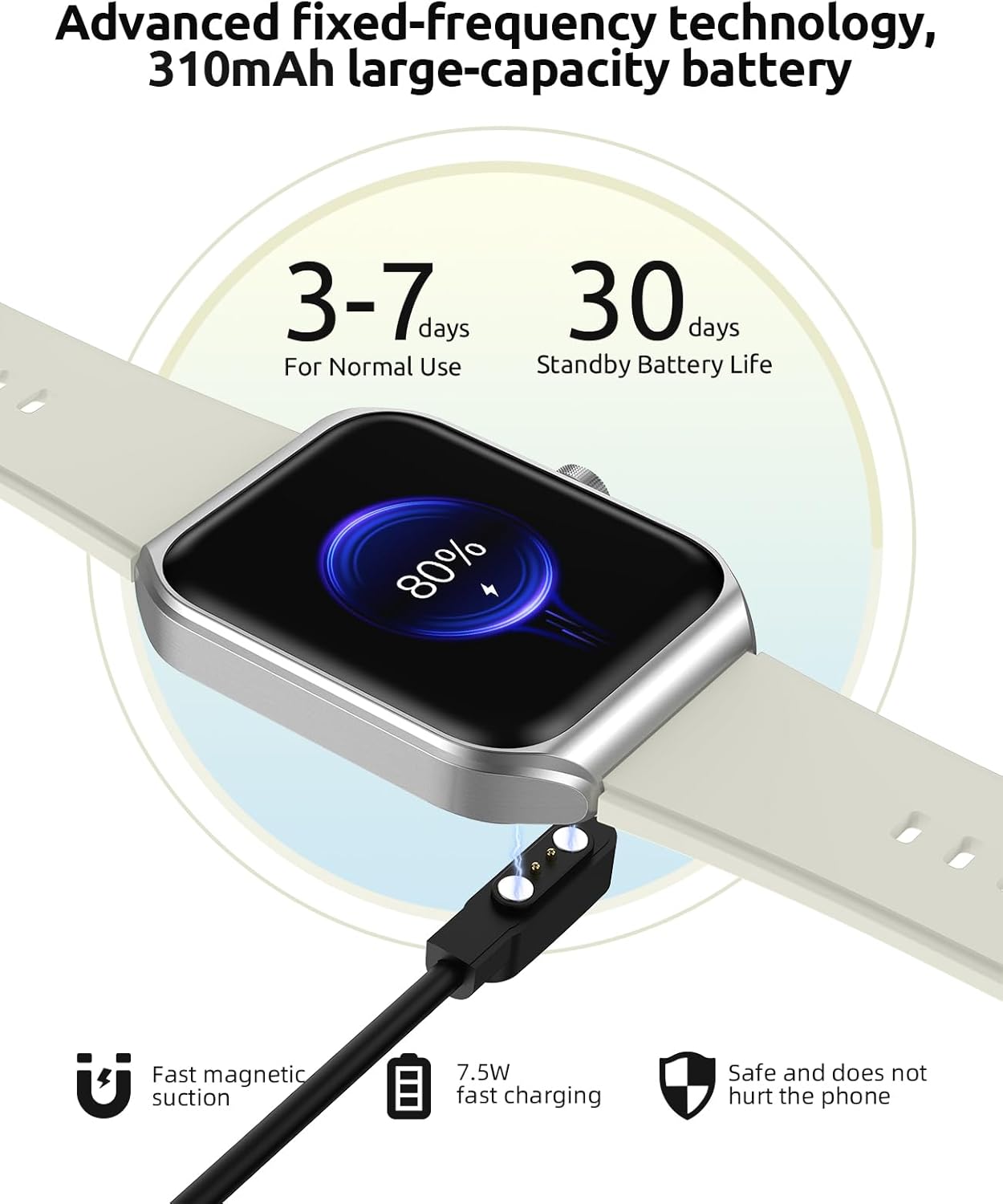 【Long-lasting Battery Life & Efficient Waterproof Performance】- The watch is powered by a 310mAh cobalt battery with a protective board, offering up to 30 days of standby time and 3-5 days of daily use. Its efficient design meets the demands of long-term usage. Furthermore, the watch boasts a sturdy IP68 waterproof rating, featuring a precision waterproof seal and successfully passing the 30-meter water pressure test. It confidently withstands daily handwashing, showers, rain, and even sweat. It is a durable companion suitable for various adventures or celebrations.