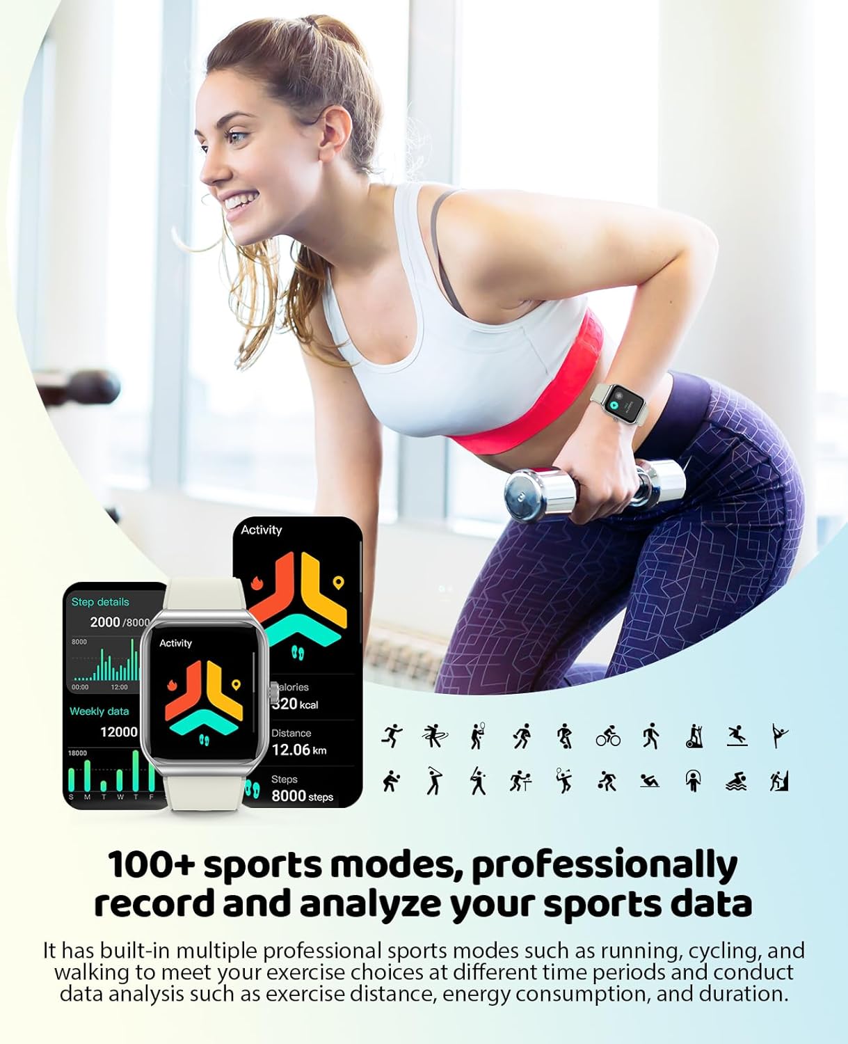 【Diverse Exercise Modes & Exercise Data Analysis】- Achieve excellent fitness results through exercise modes and data analysis. The smart watches are equipped with various professional exercise recognition analyzers and support daily exercise data analysis, providing valuable insights on energy consumption, calories, exercise distance, and step count, encouraging users to stay active. The smart watch supports over 100 professional exercise modes, allowing you to monitor and analyze your performance in various activities such as running and cycling. Utilize these detailed data to optimize your workouts, improve your performance, and stay motivated on your fitness journey.
