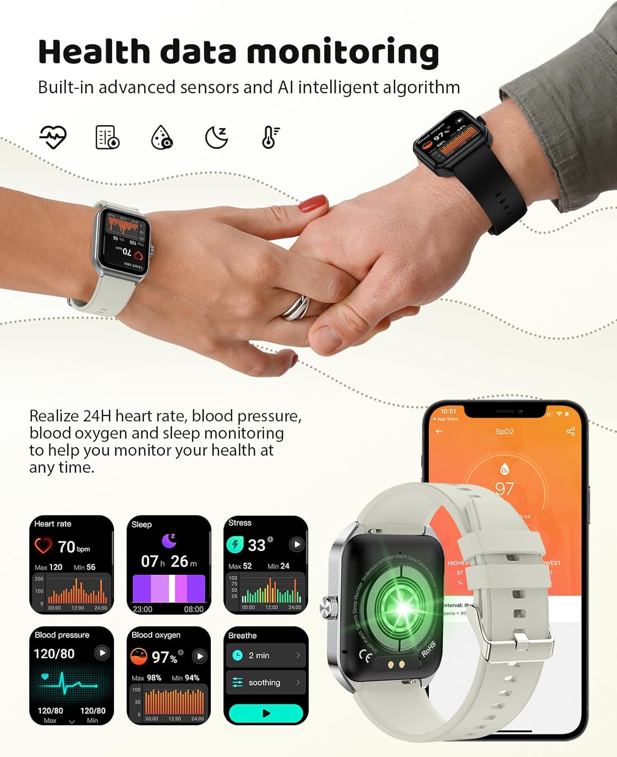 【Comprehensive Health Monitoring】- Our watch incorporates advanced sensors and AI-powered algorithms to provide real-time monitoring of heart rate, blood pressure and blood oxygen. It also features continuous sleep pattern tracking, accurately assessing sleep quality, and includes a unique function for monitoring emotions, offering a deeper understanding of emotional well-being. Designed specifically for women’s health, this watch includes menstrual cycle monitoring and management features. Additionally, it promotes an active lifestyle by providing reminders to avoid prolonged sitting and combines breathing exercises and stress monitoring to achieve comprehensive health tracking.