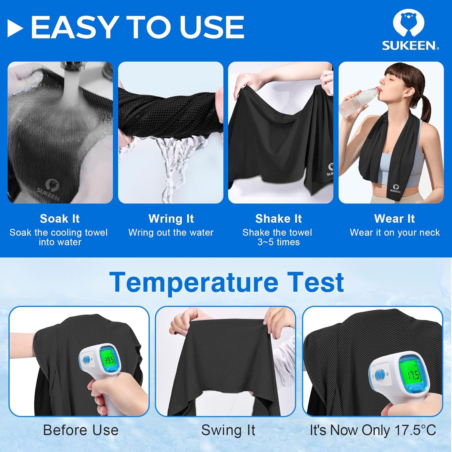 Cooling Towels for Hot Weather: Sukeen cooling towel stays chilled for up to 3 hours (depending on conditions). No chemicals are used in the making of the cooling towel. It is perfect for hot flashes, outdoor activities, indoor sports, fever or headache treatment, heat stroke prevention, UV sun protection, and cooling while absorbing.