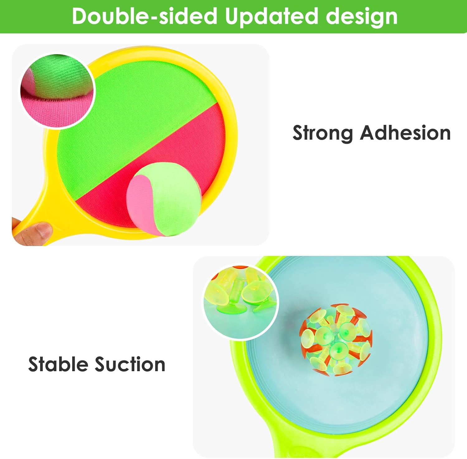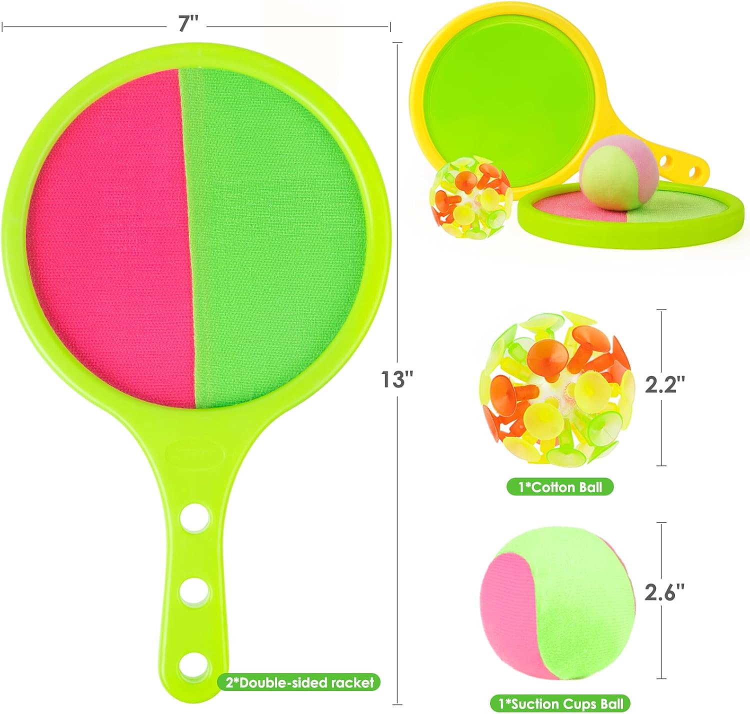 Toss and Catch Velcro Ball Set: Includes 2 catch rackets and 2 balls(cotton ball and suction cups ball). Pick yours up today and enjoy the outdoors with your family and friends!