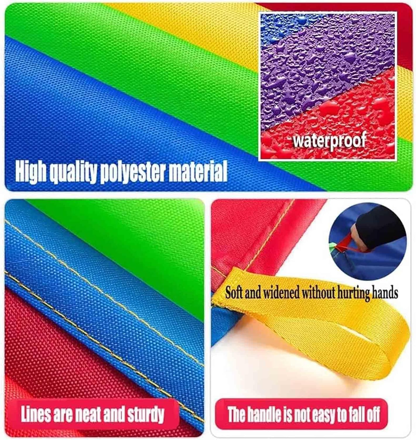 Reliable Material: This rainbow parachute is made of polyester, nontoxic and durable, waterproof;The cloth is thick and not easy to be tear, easy to clean and can be applied for a long time. Rainbow parachute reinforced handles are extra strong which ensure safety and health for kids when playing games.
