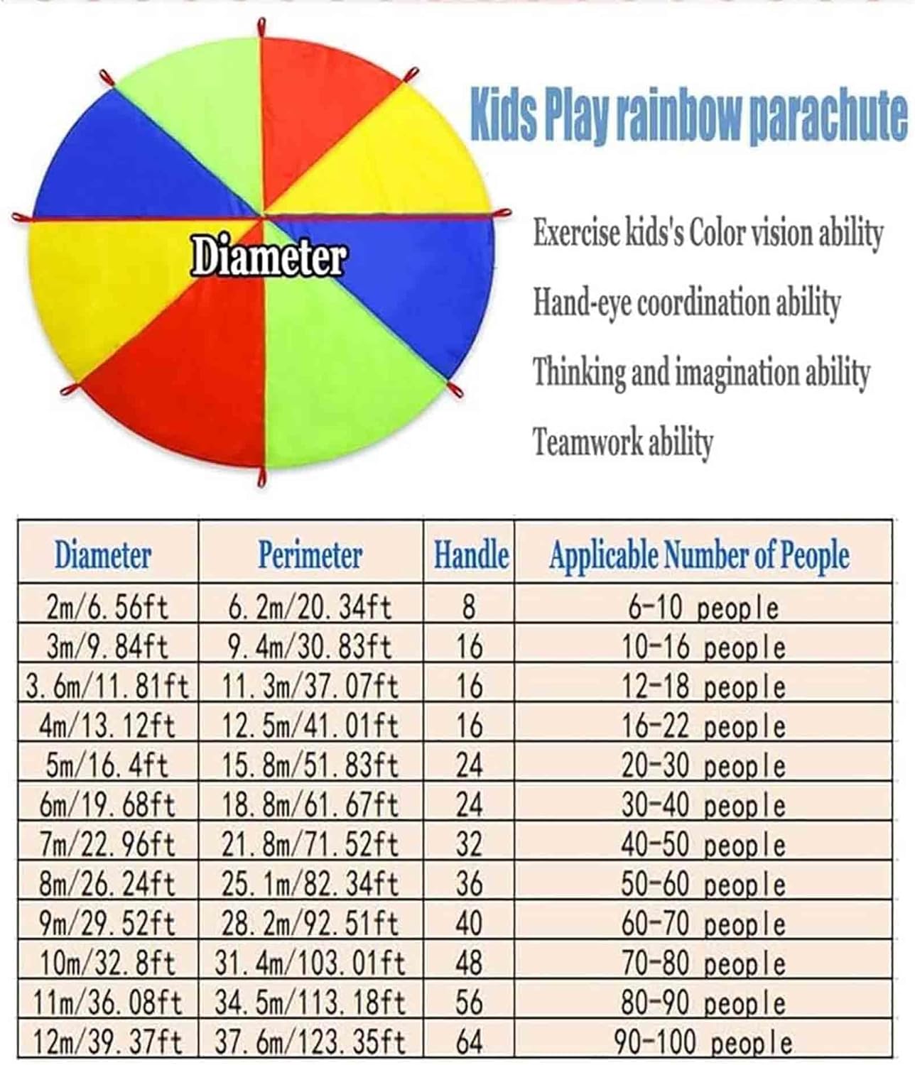 Large Size: This rainbow parachute is 212 meters long (6.56ft39.37ft) with separate reinforced handles evenly distributed around the parachute for group play of 6100, which allows multiple children to play together; The types of games are richer and more interesting, giving children more fun time.