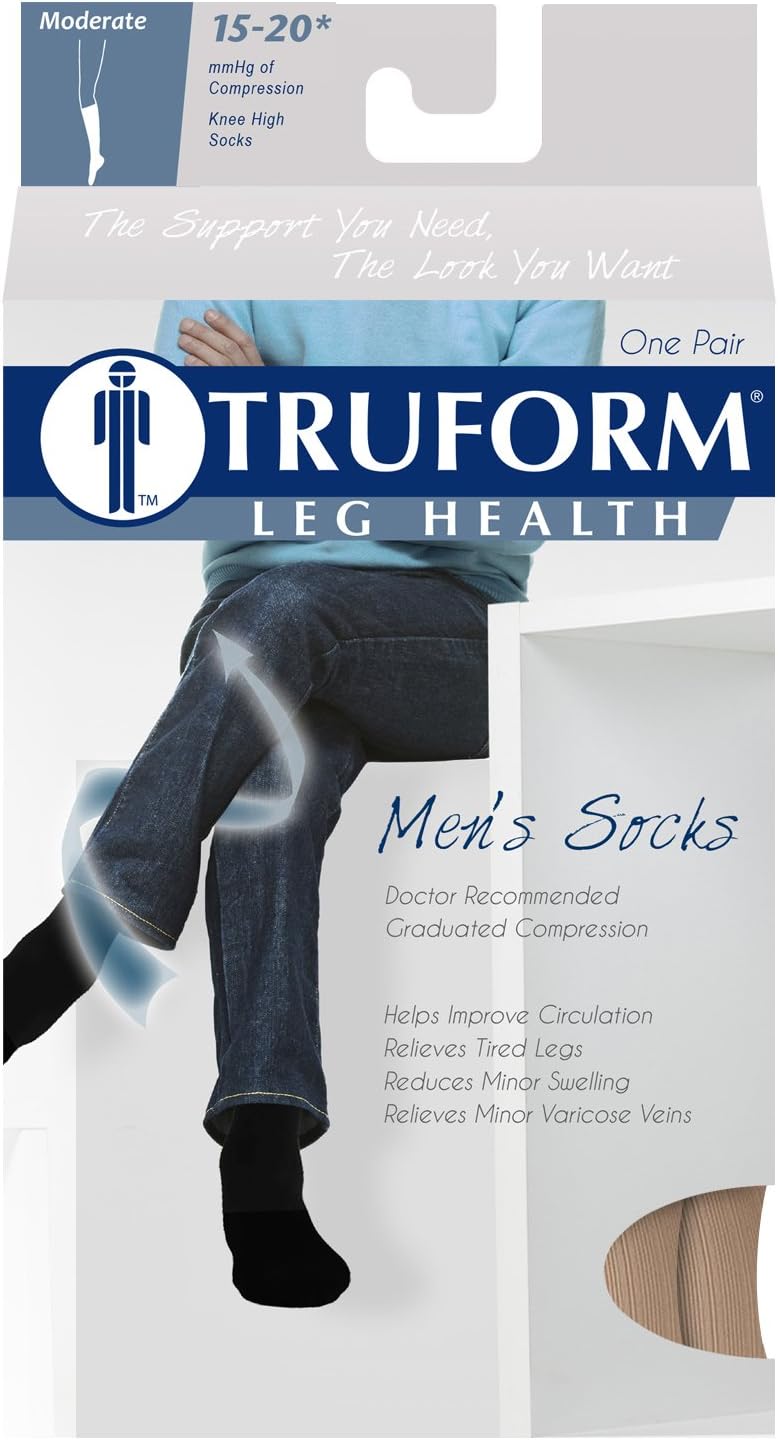 Truform 1933 is a casual, knee high sock designed to help improve circulation and reduce leg discomfort. A shock absorbing cushioned toe, sole, and heel combine with breathable yarns provides all-day wearing comfort. Ideal for tennis, golfing, jogging, walking, or any other leisure activity that requires comfort and support. Truform graduated compression support hosiery at a moderate 15-20 mmHg compression helps maintain positive circulation and leg health.