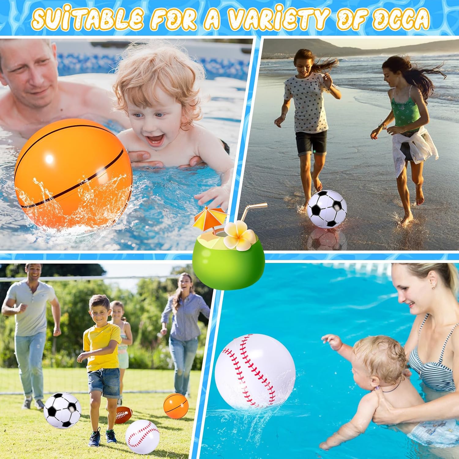 Inflatable Sports Balls – Our inflatable balls are made of high-quality PVC plastic material, high-resilience and durable enough for kids or adults to kick, throw and play catch game on the beach, pool, backyard, park etc. Soft enough and with no sharp parts, to ensure it will not hurt anyone and anything.